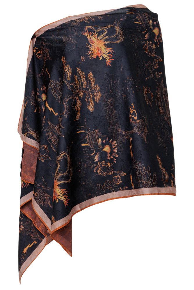 Shopika Esarfa dreptunghiulara cu doua fete, din matase, cu imprimeu oriental cu lotusi in nuante galben auriu