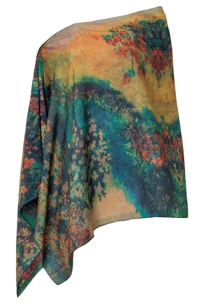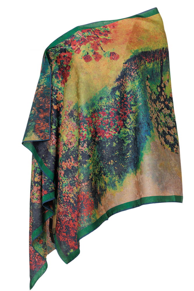 Esarfa dreptunghiulara cu doua fete, din matase, cu imprimeu vegetal in nuante de verde, rosu si galben auriu