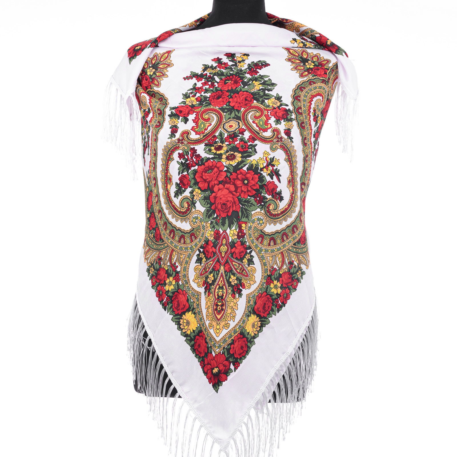 Shopika Esarfa gipsy patrata mare, tip Pavlovo Posad cu imprimeu floral traditional pe fond alb
