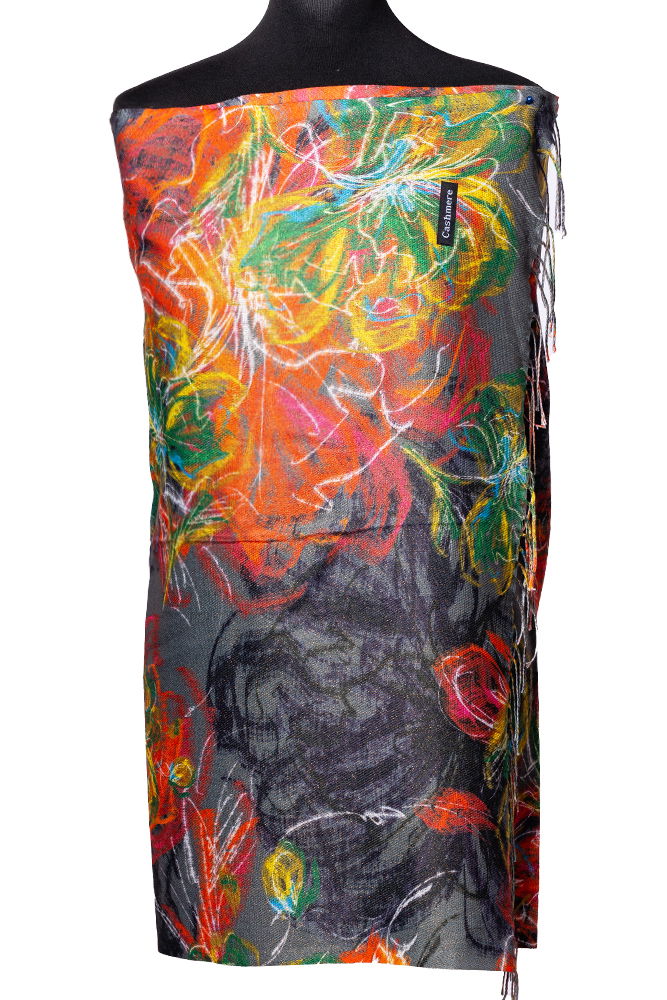 Shopika Esarfa cashmere cu fir din lurex, flori stilizate pe fond gri