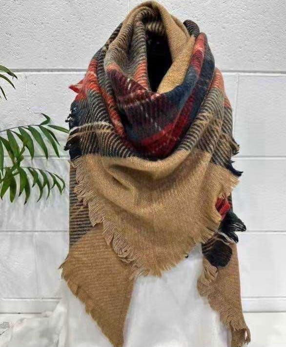 Esarfa din lana si vascoza cu imprimeu ecosez pe fond camel, forma triunghiulara
