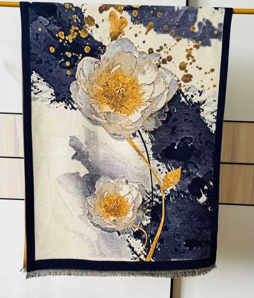 Esarfa premium din lana si vascoza cu bujori albi pe fond ivoriu si bleumarin
