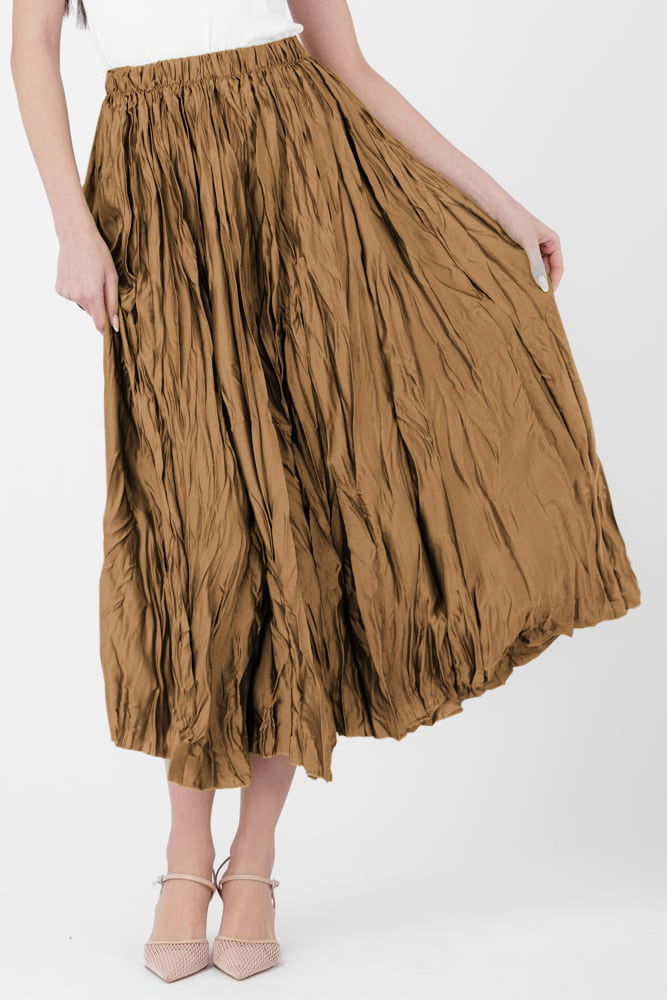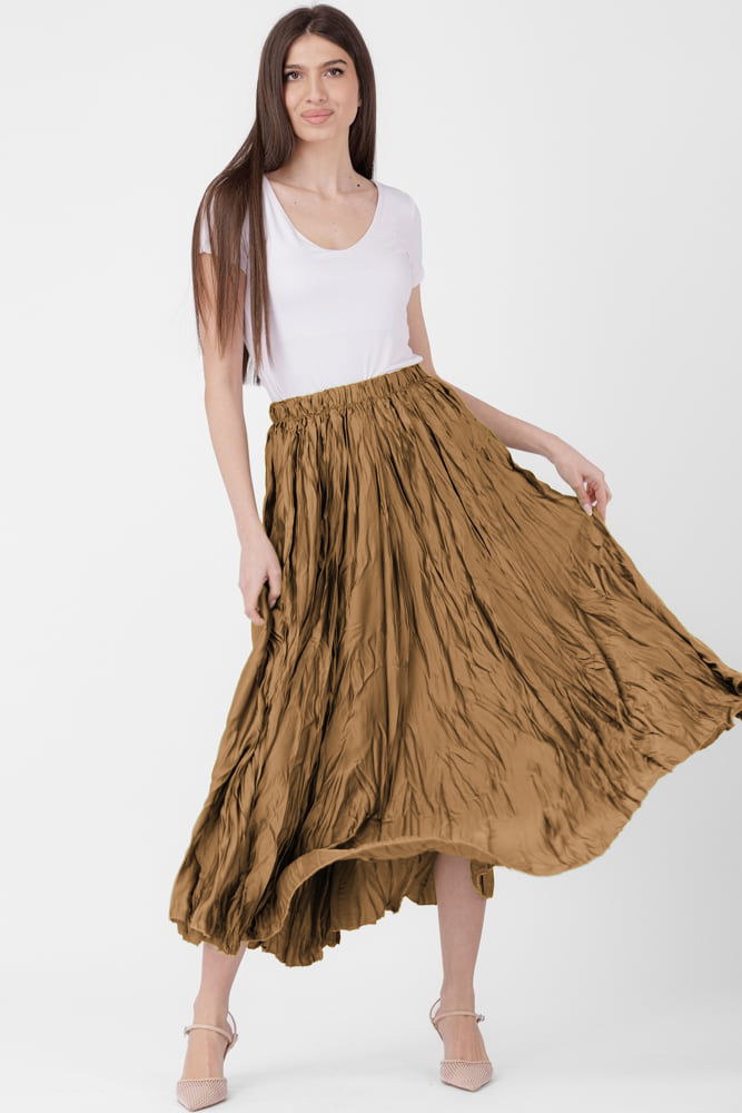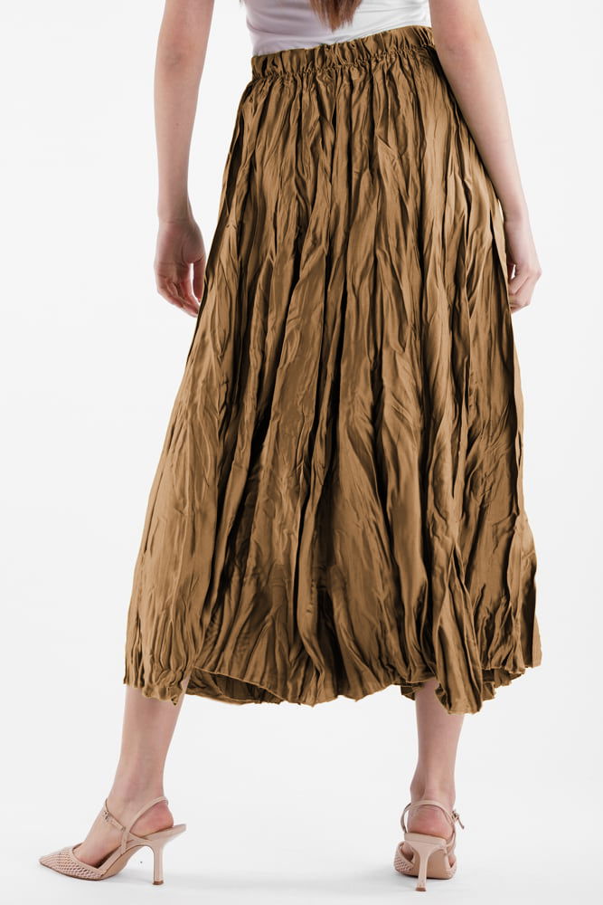 Fusta lunga, ampla, creponata, lucios-satinata, camel deschis