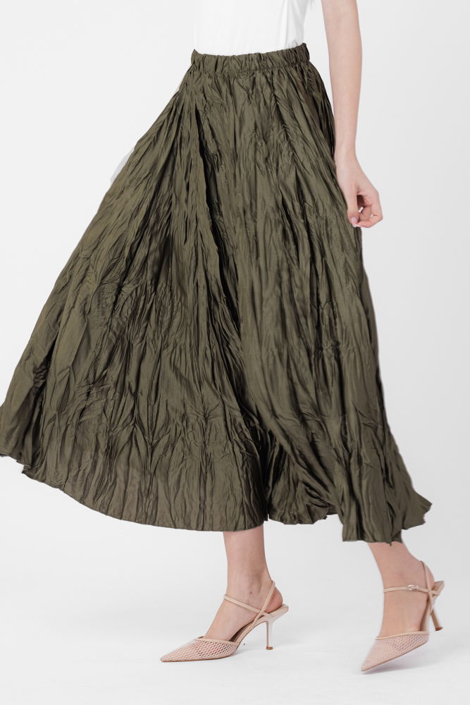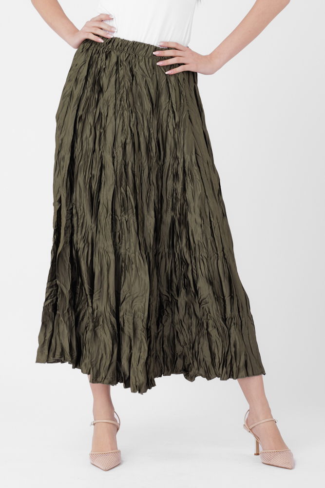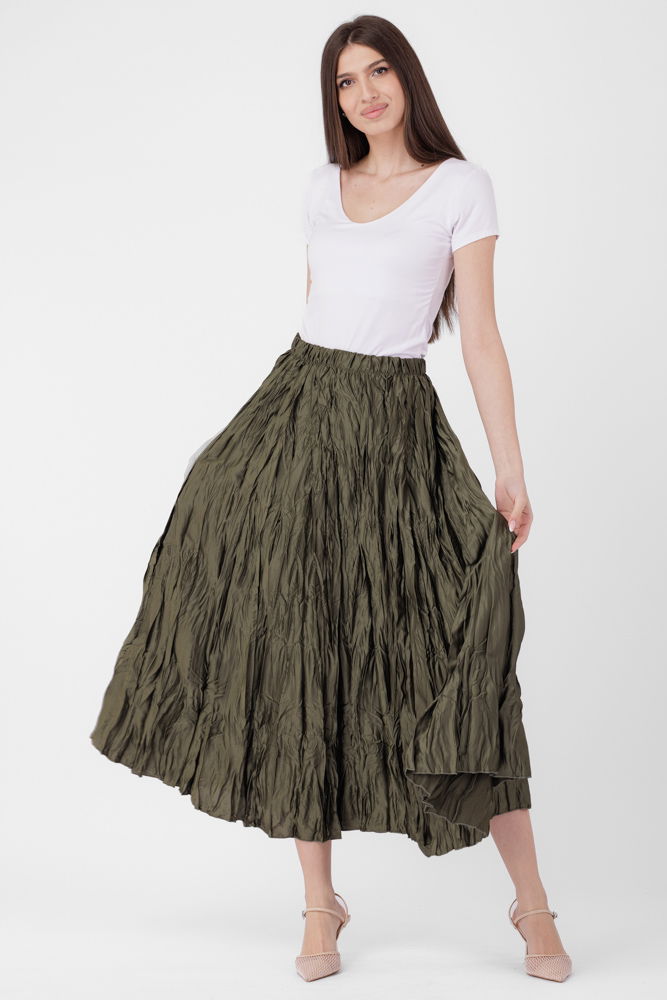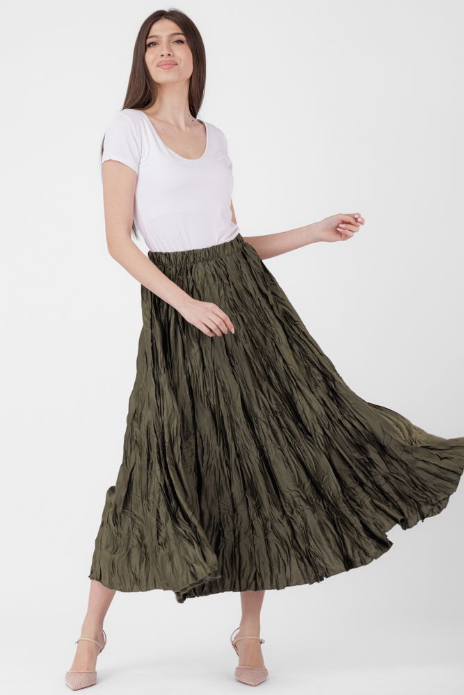 Fusta lunga, ampla, creponata, lucios-satinata, kaki