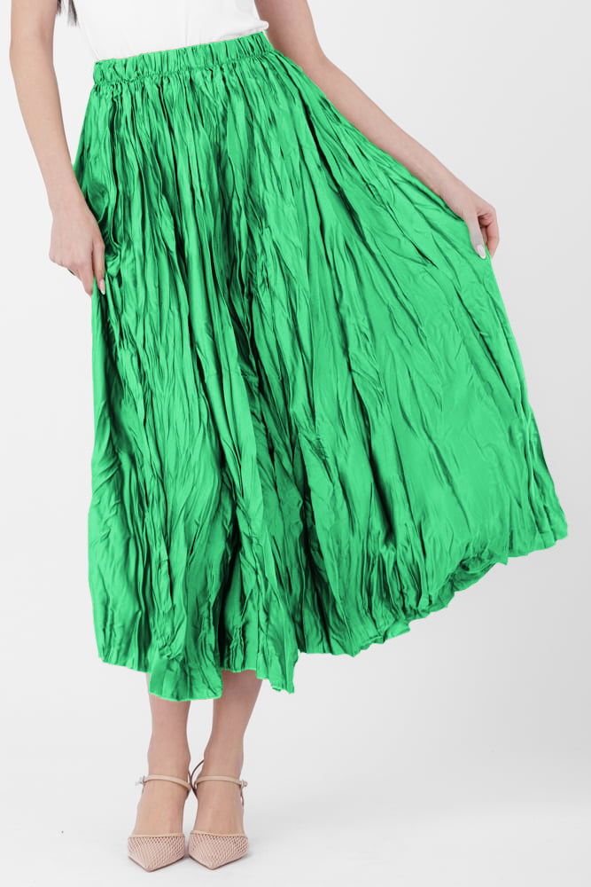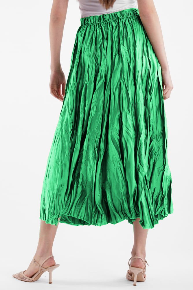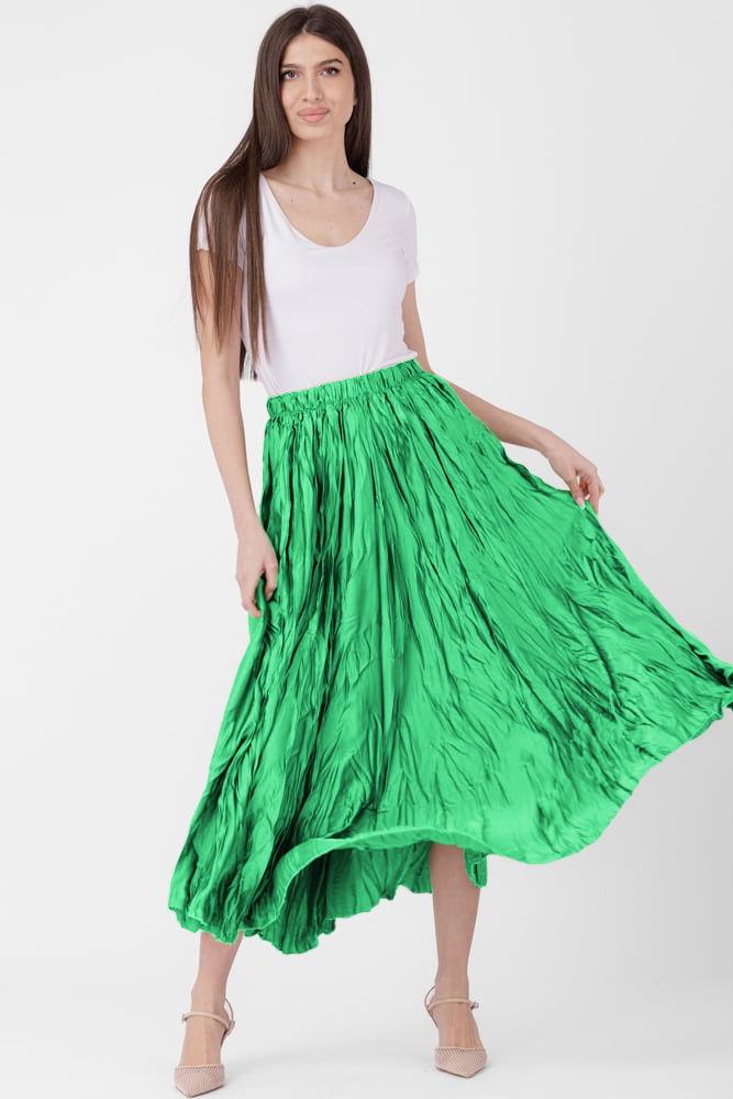 Fusta lunga, ampla, creponata, lucios-satinata, verde deschis