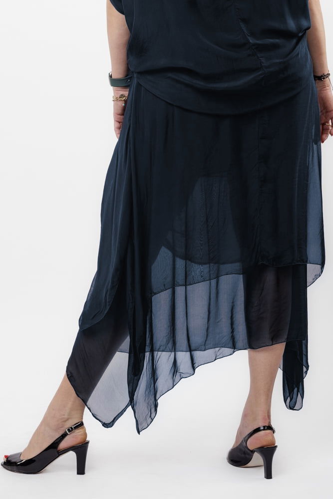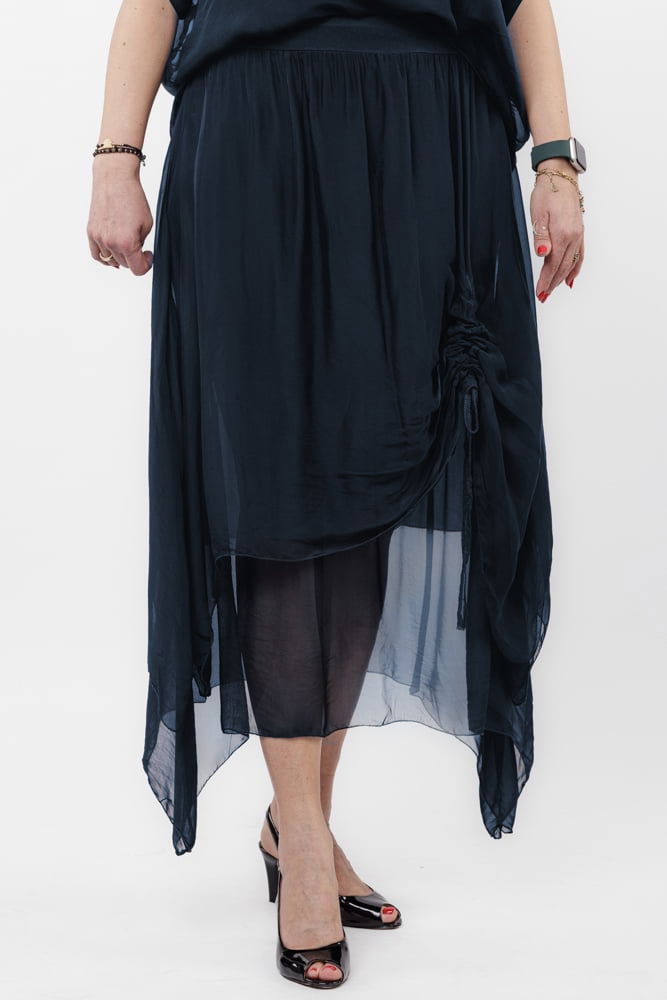 Fusta lunga in colturi, din matase si vascoza, suprapusa, cu snur vertical, bleumarin