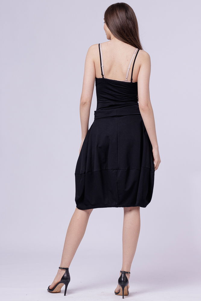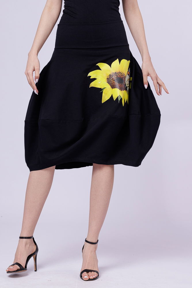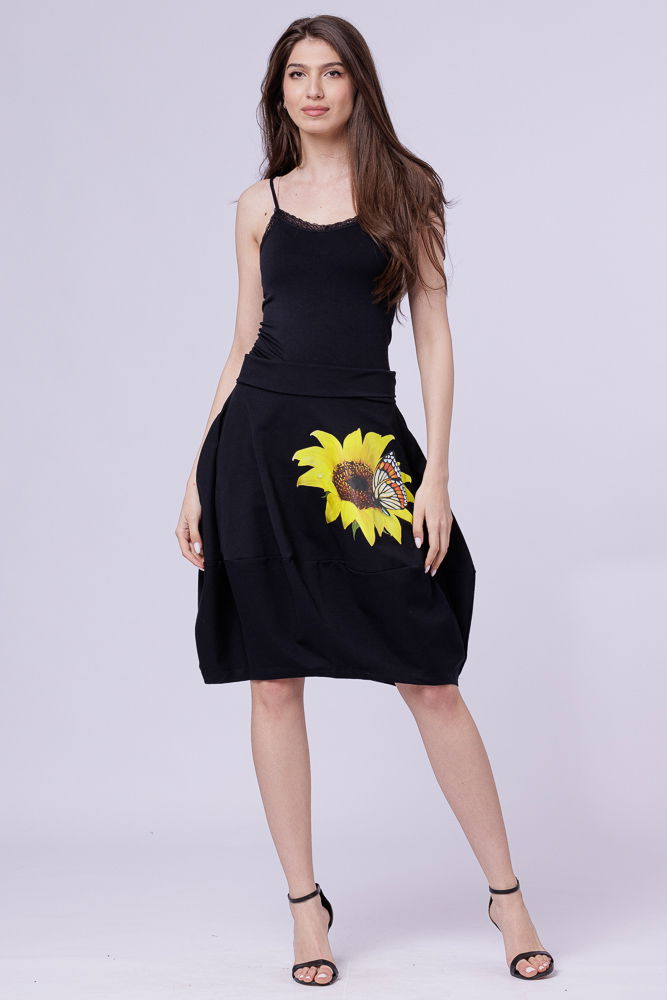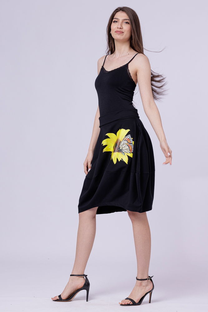 Pierino Fusta neagra din jerseu, midi, tip lalea, cu imprimeu floarea soarelui si fluture