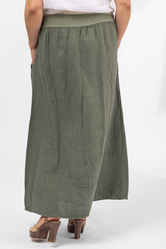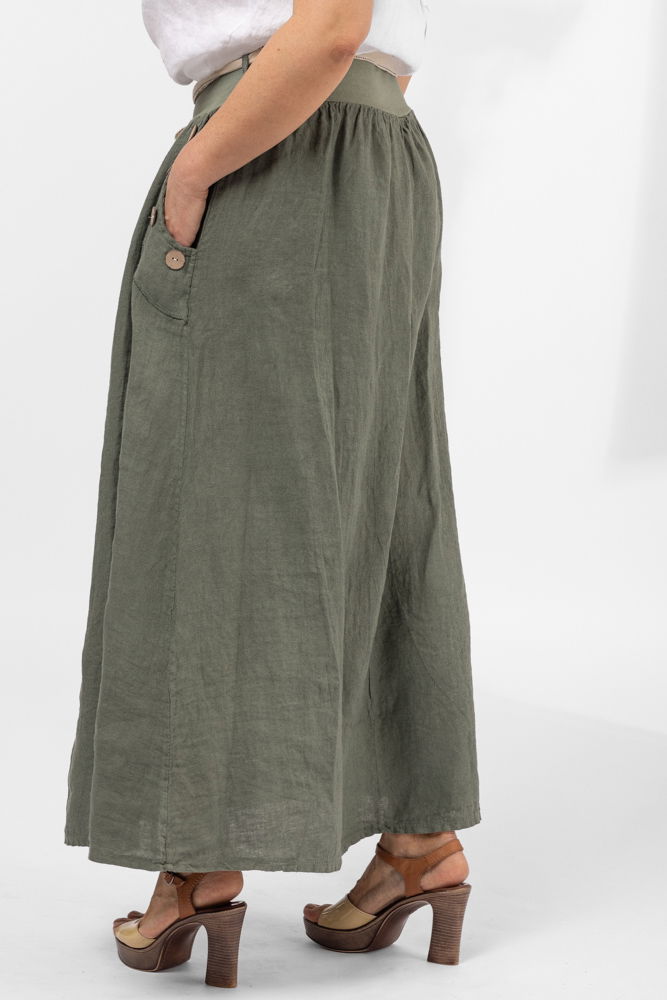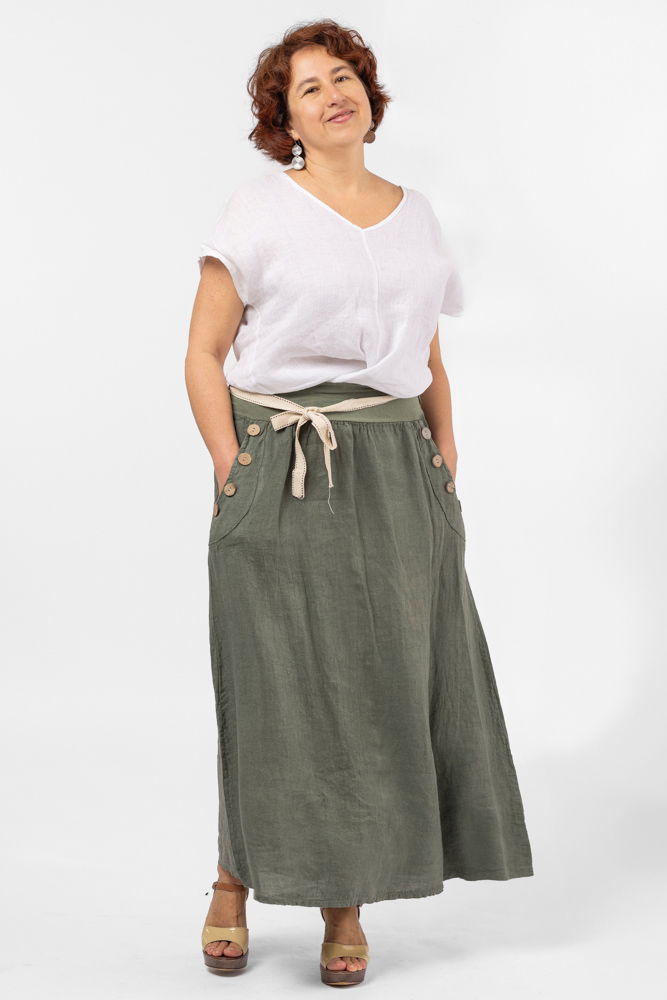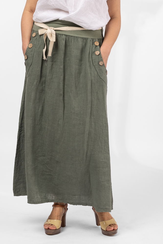 Shopika Fusta lunga casual, kaki, din in, cu nasturi de lemn la buzunare
