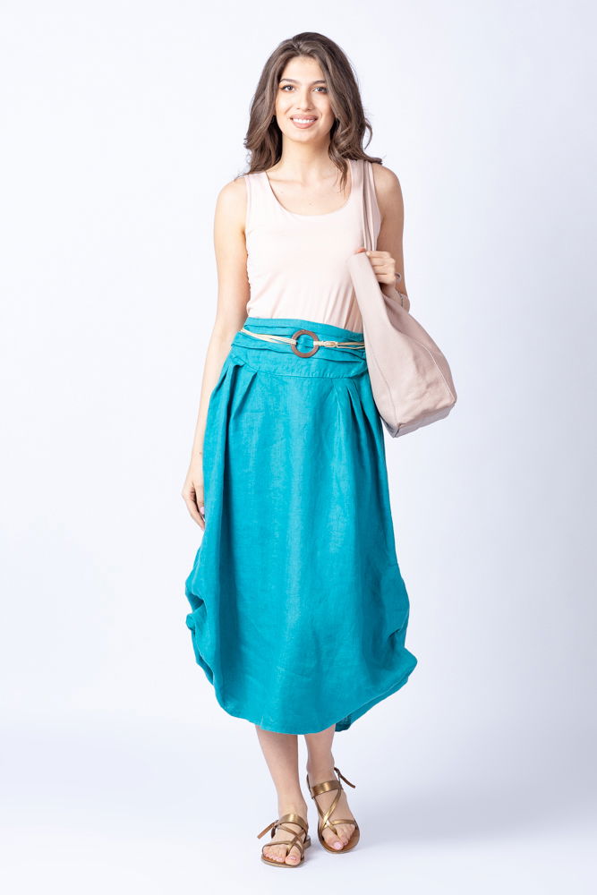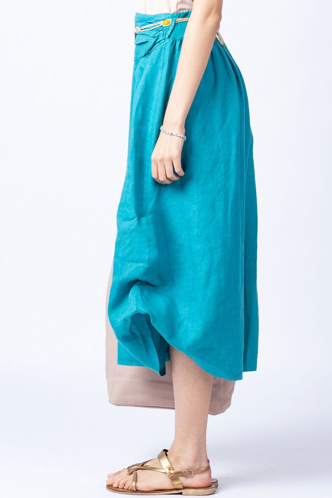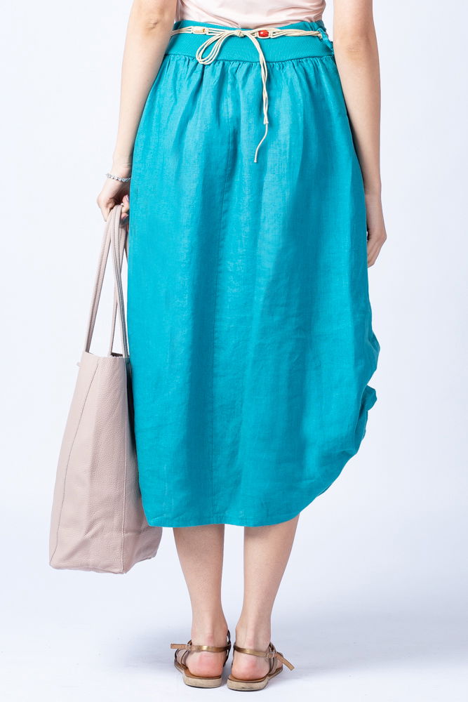 Shopika Fusta lunga turcoaz cu poale prinse, din in, cu o curea fancy