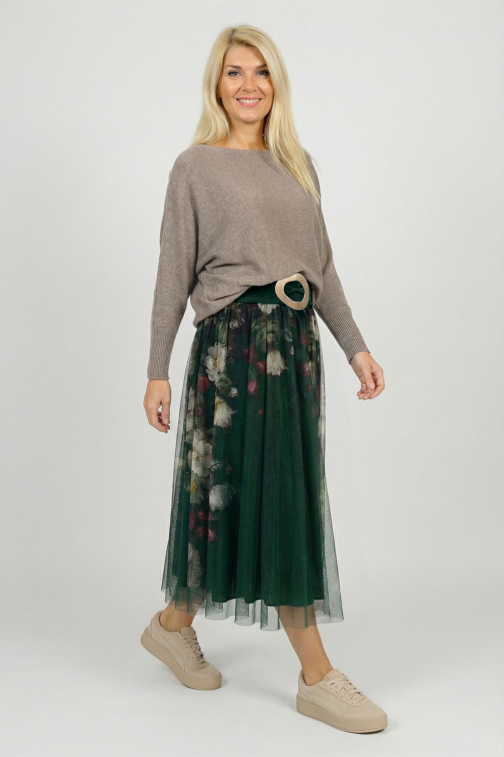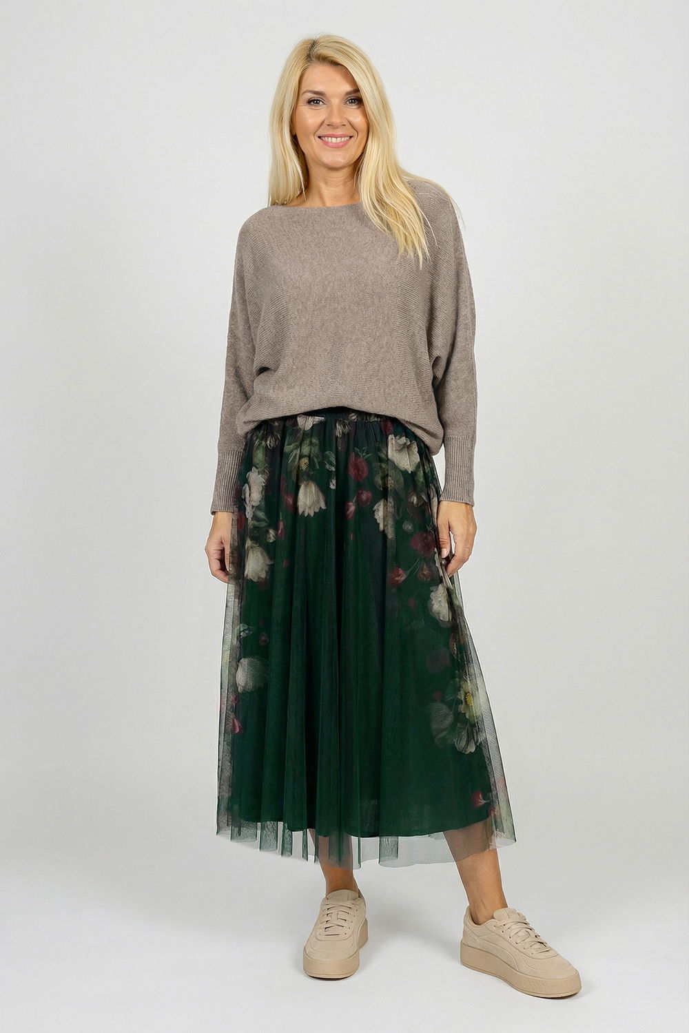 Shopika Fusta clos din tulle cu imprimeu lateral floral in nuante de verde inchis