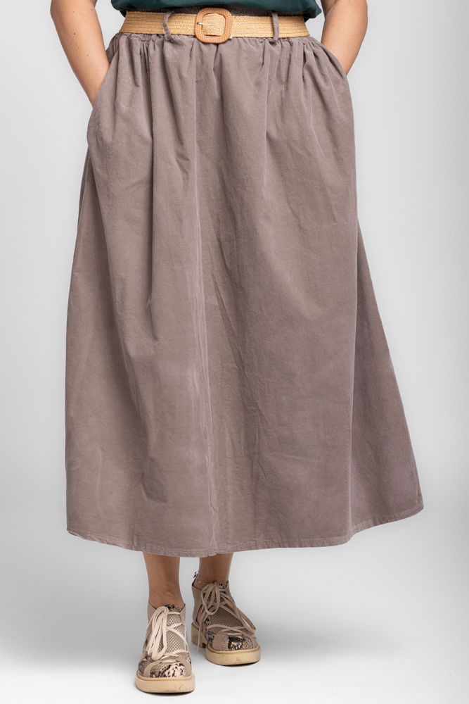 Fusta lunga bej din catifea reiata, cu curea inclusa