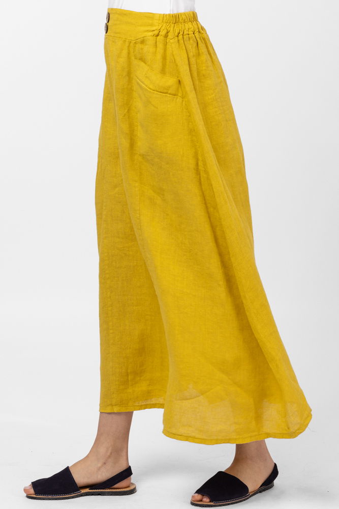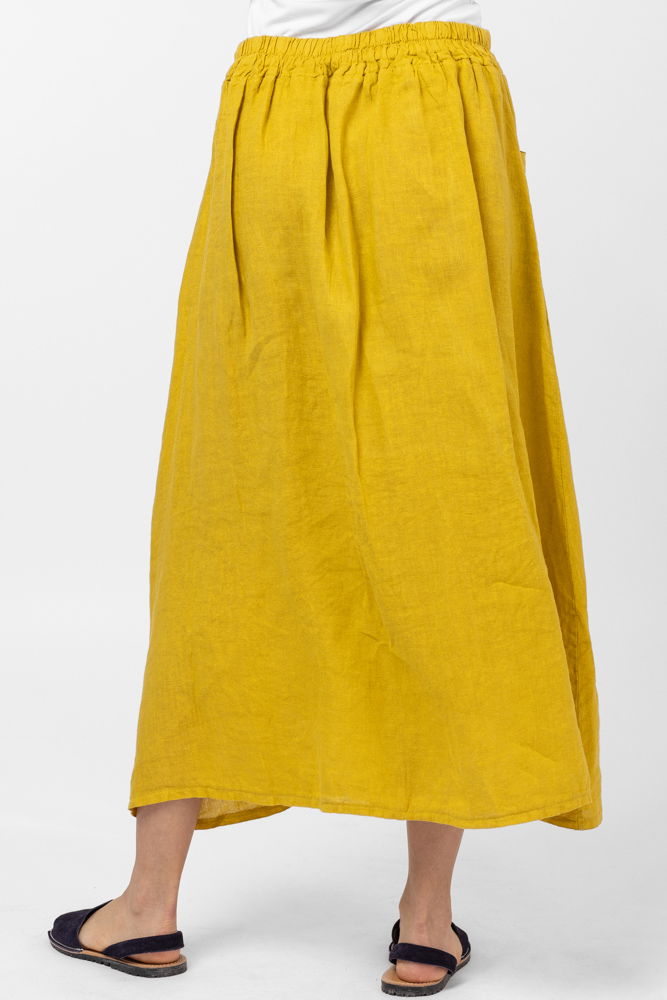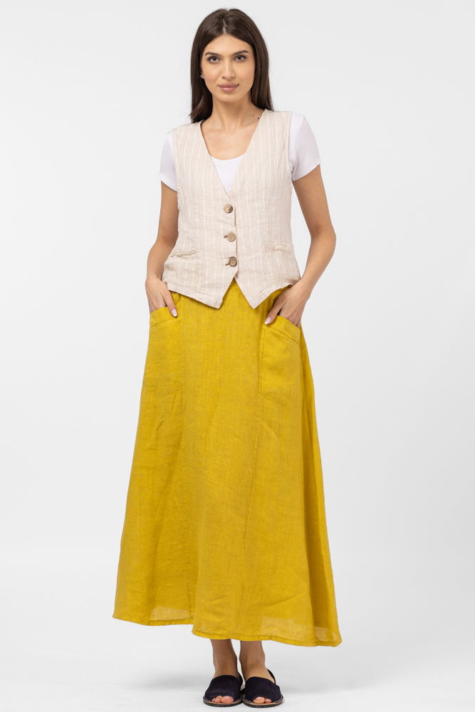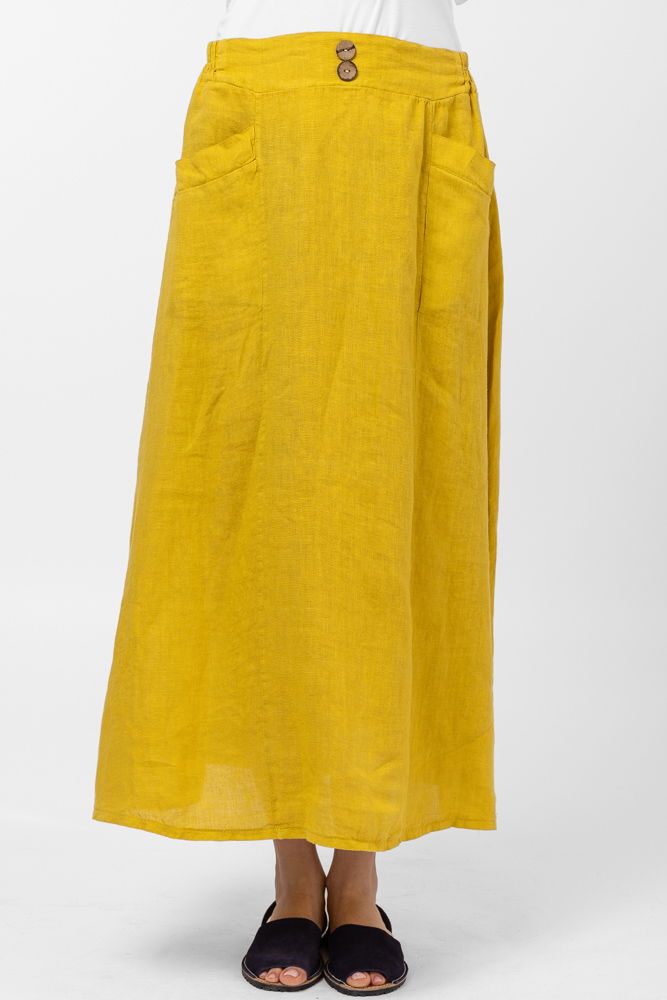 Shopika Fusta lunga din in, cu doi nasturi de lemn pe talie, galbena