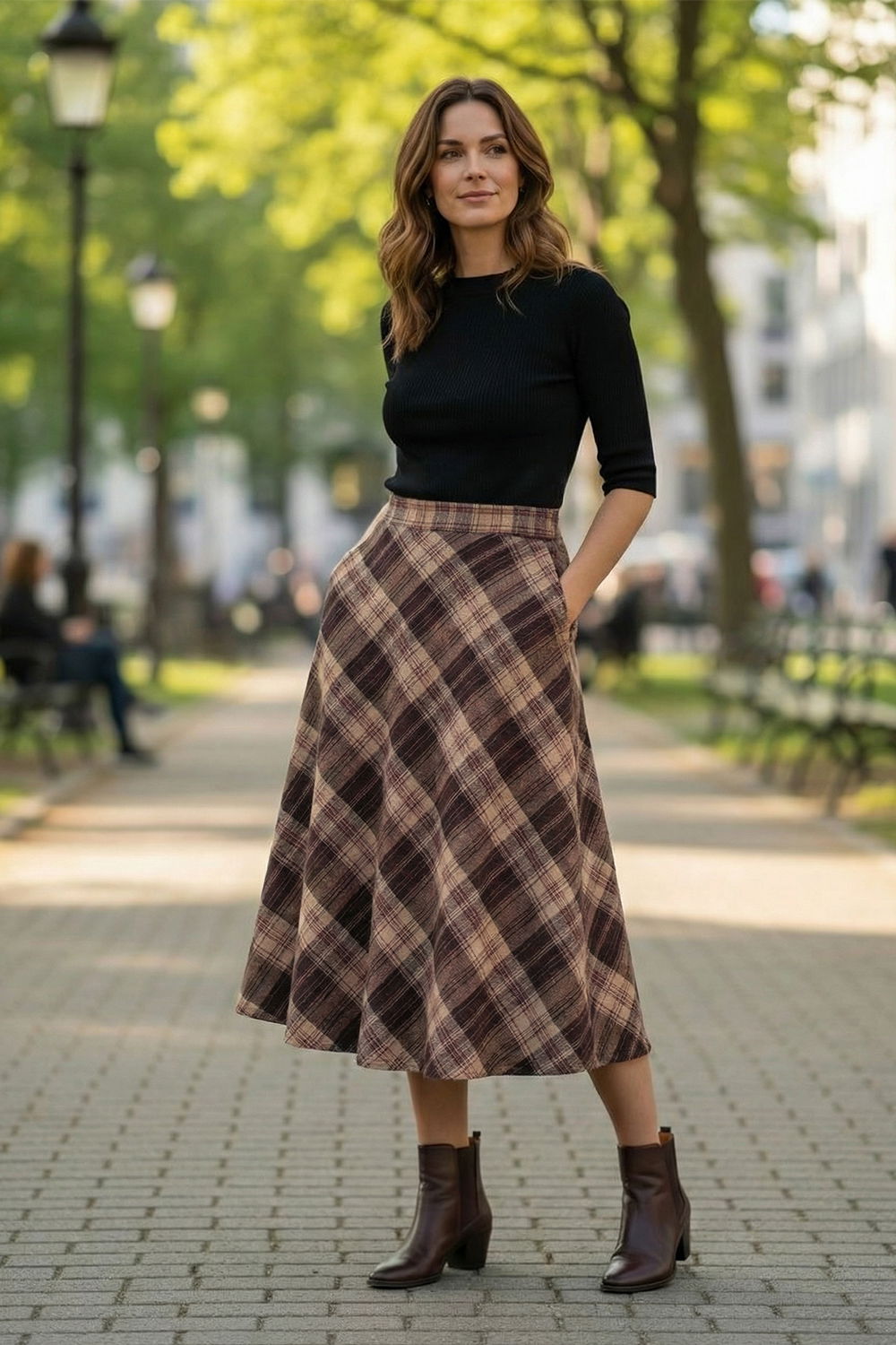 Eleganta atemporala prinde contur intr-o fusta midi evazata, cu imprimeu clasic in carouri si croiala fluida, gandita pentru femeia care apreciaza rafinamentul discret. Talie inalta, bine definita, alungeste silueta, in timp ce volumul amplu al fustei ofera libertate de miscare si o cadere naturala, extrem de feminina.