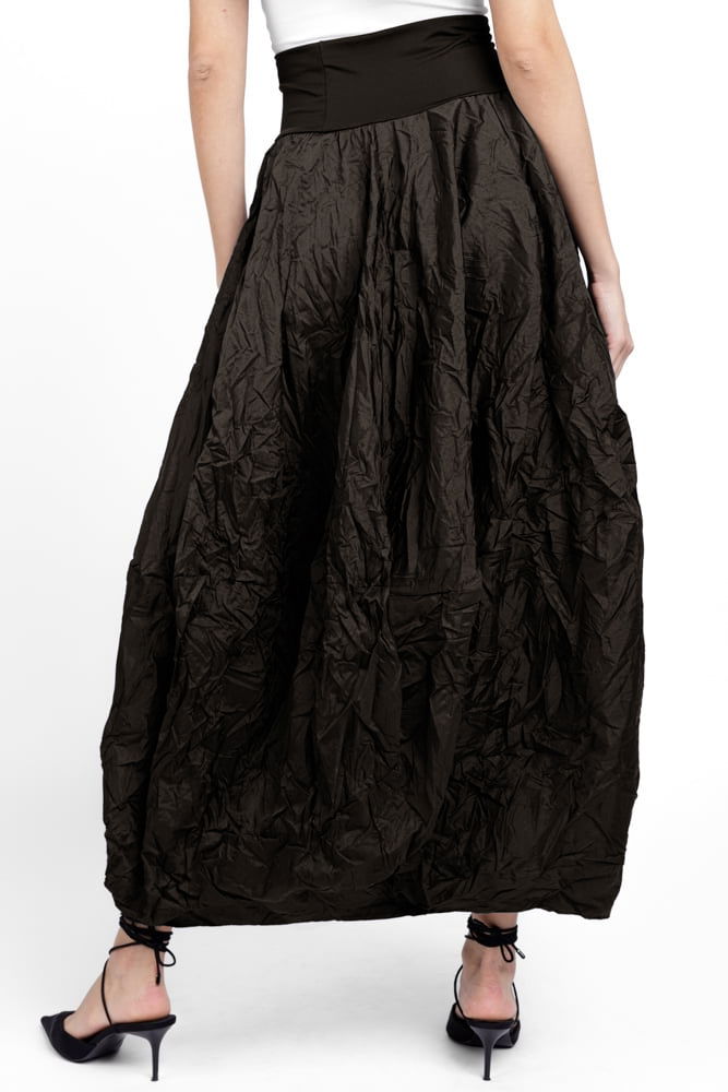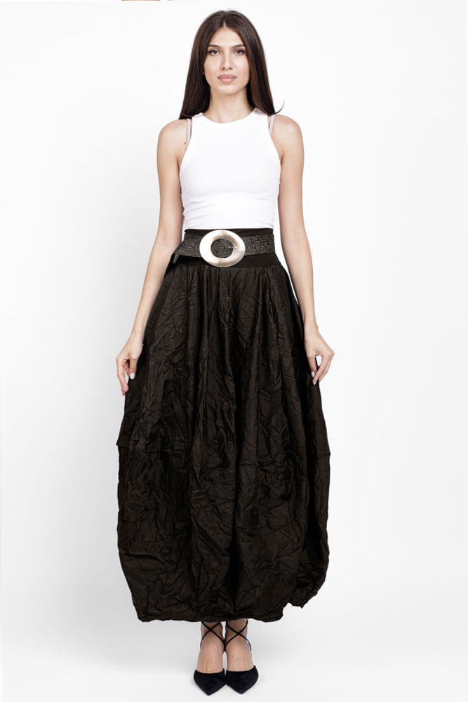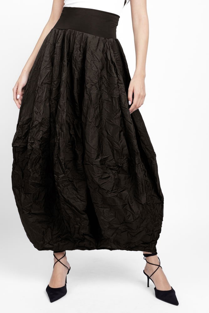 Fusta tip lalea este confectionata din tafta cu fir metalic, cu memorie. ce pastreaza forma pe care i-o dai, astfel o poti umfla sau o poti tine mai pe langa corp, functie de restul elementelor tinutei tale si de inspiratia si starea de spirit din acea zi.