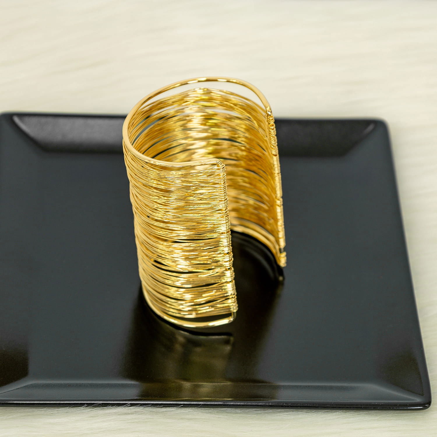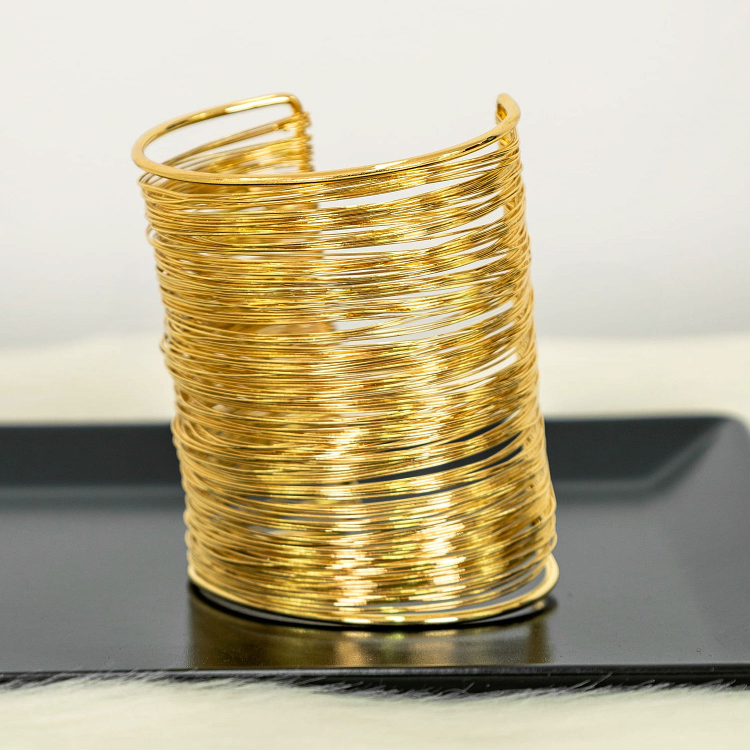 Un accesoriu sculptural care atrage instant privirea. Brățara aurie spiralată redefinește eleganța prin liniile sale fluide, suprapuse, ca un joc de lumini în mișcare. Textura fină, metalul lucios și forma amplă creează un efect contemporan, cu volum echilibrat și rafinament artistic.