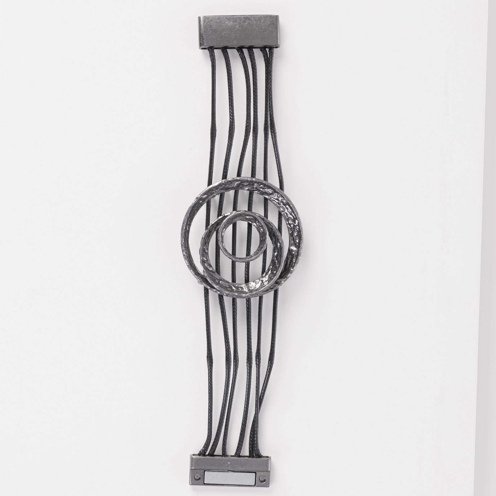 Bratara are un element mare de 5 x 5 cm inserat pe 6 fire textile si se inchide magnetic