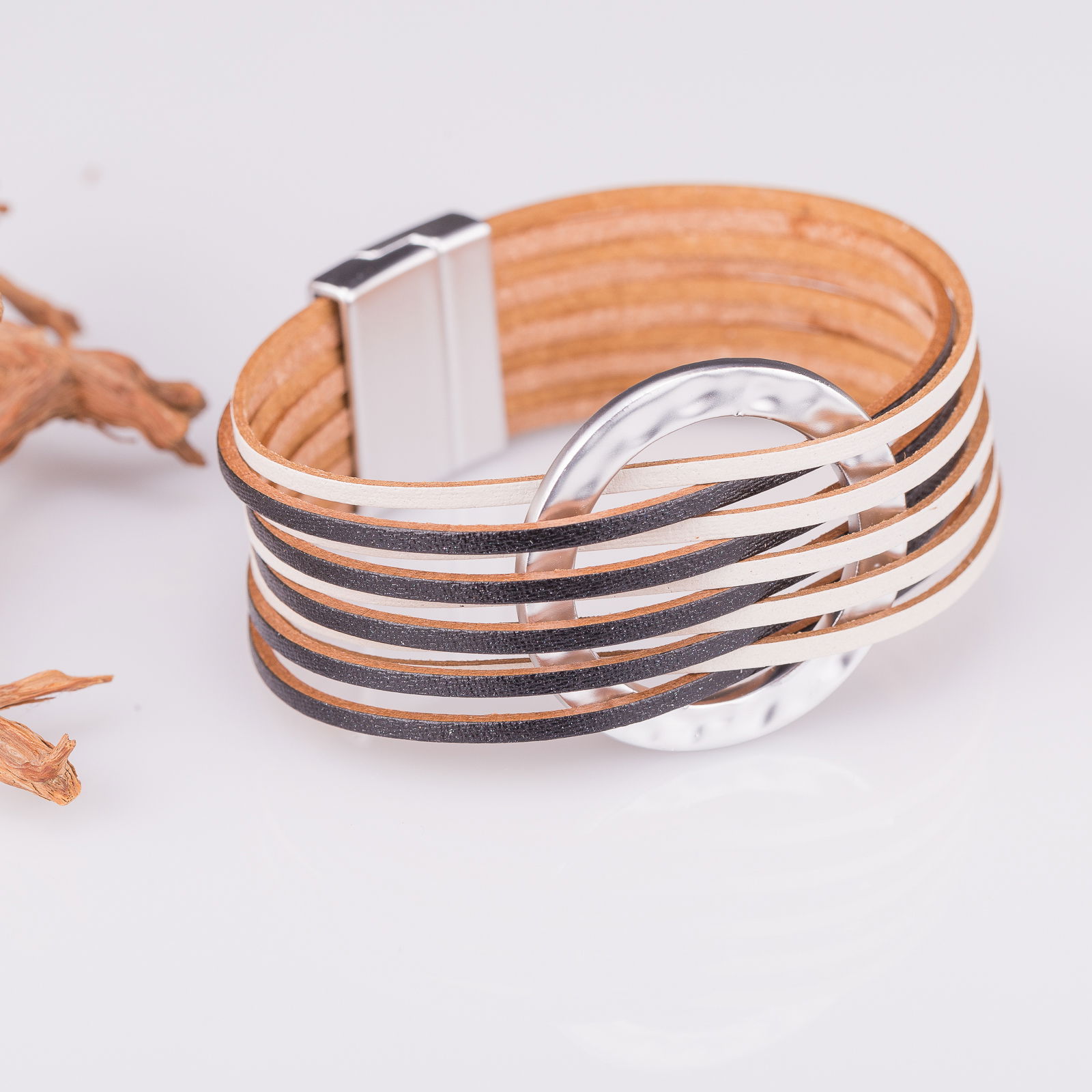 Bratara cu 10 siruri din imitatie piele in care este inserat un cerc de metal argintiu cu diametrul de 3 cm.