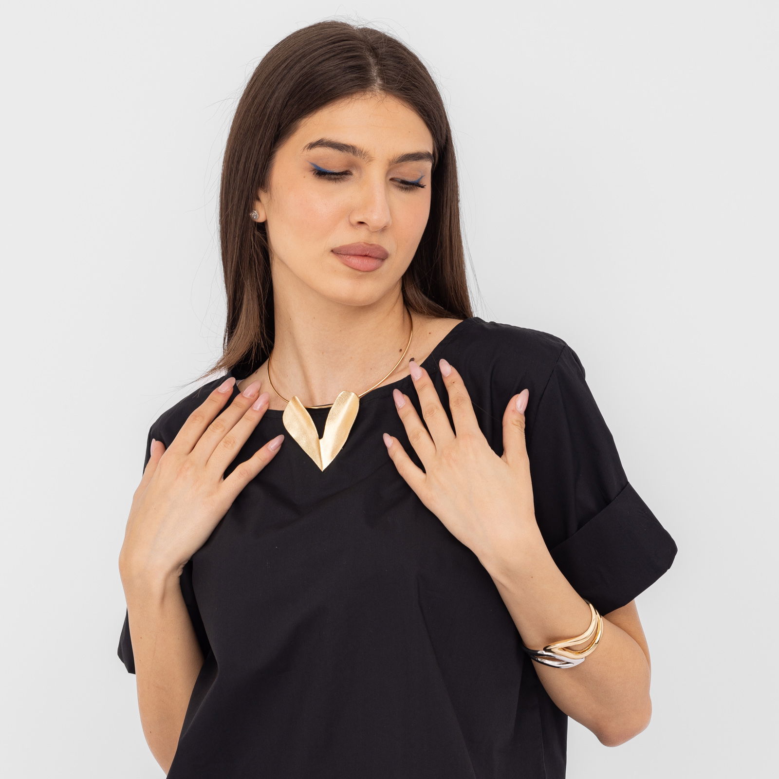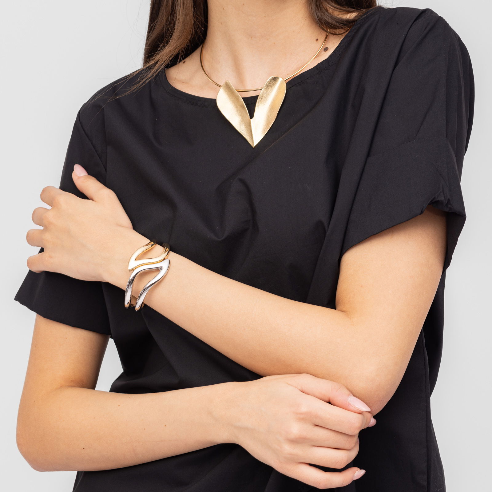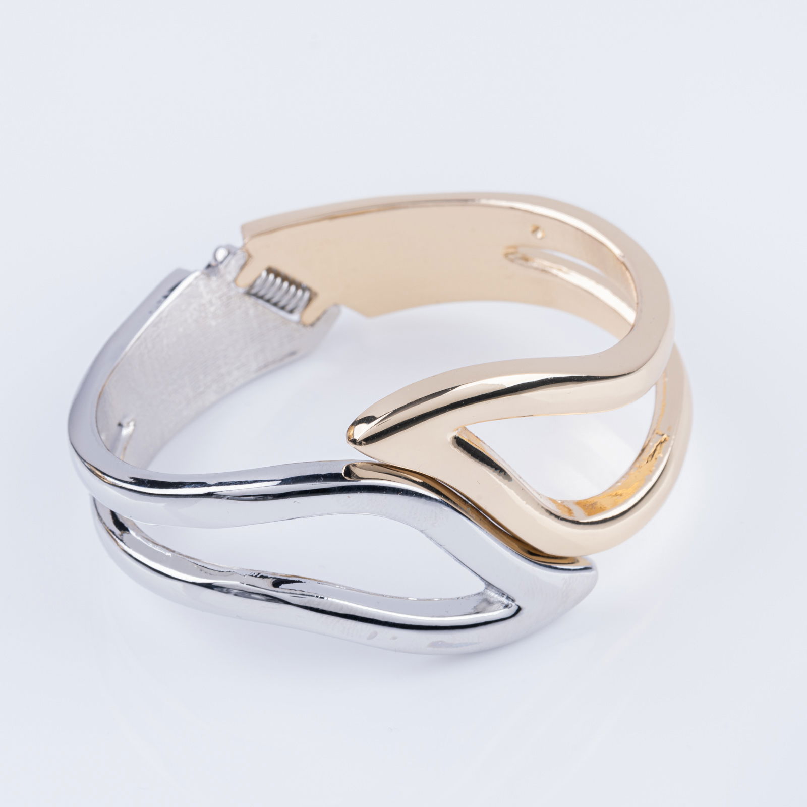 Bratara jumatate aurie si jumatate nichel este confectionata dintr-un material metalic si are goliri cu margini rotunjite.