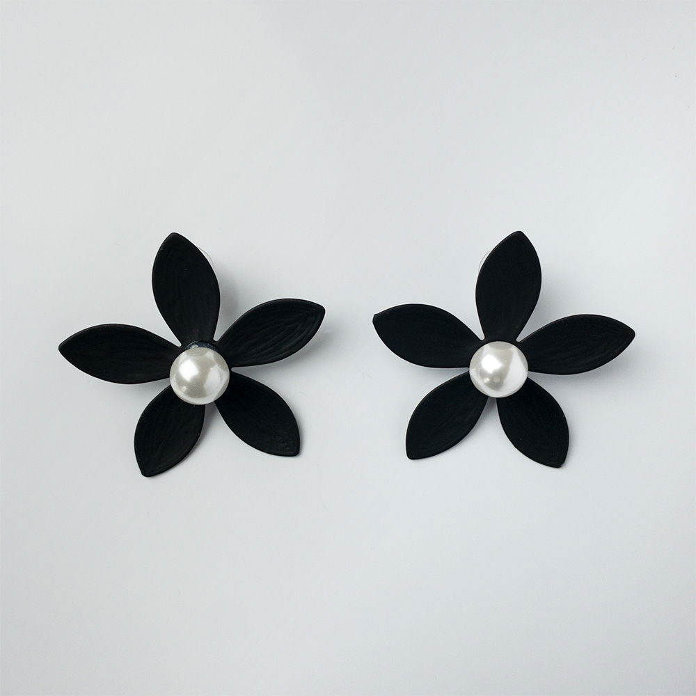 Shopika Cercei in forma de floare cu cinci petale si perla sintetica alba in mijloc, negru mat