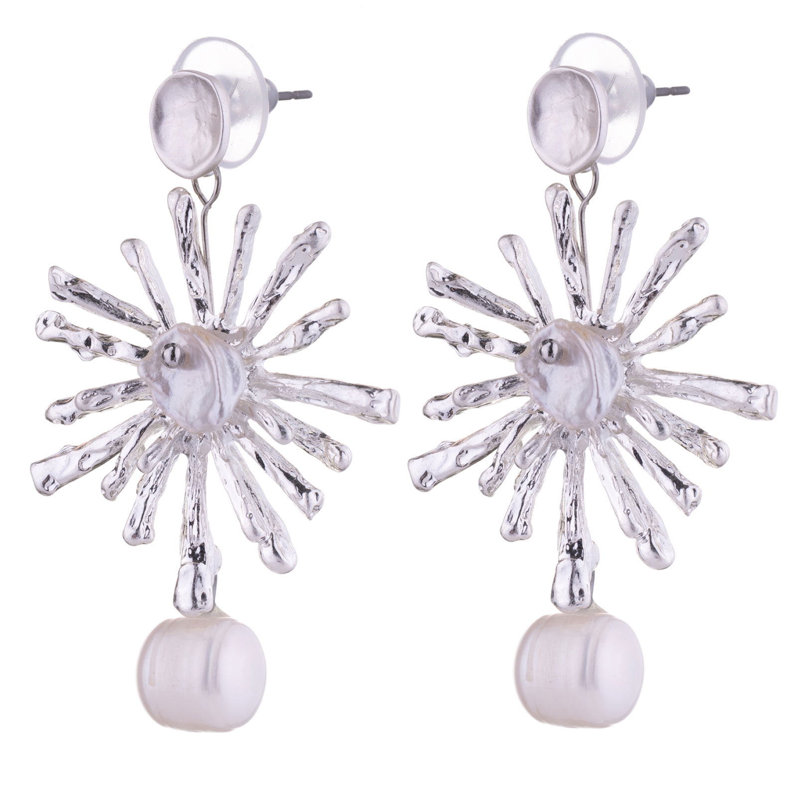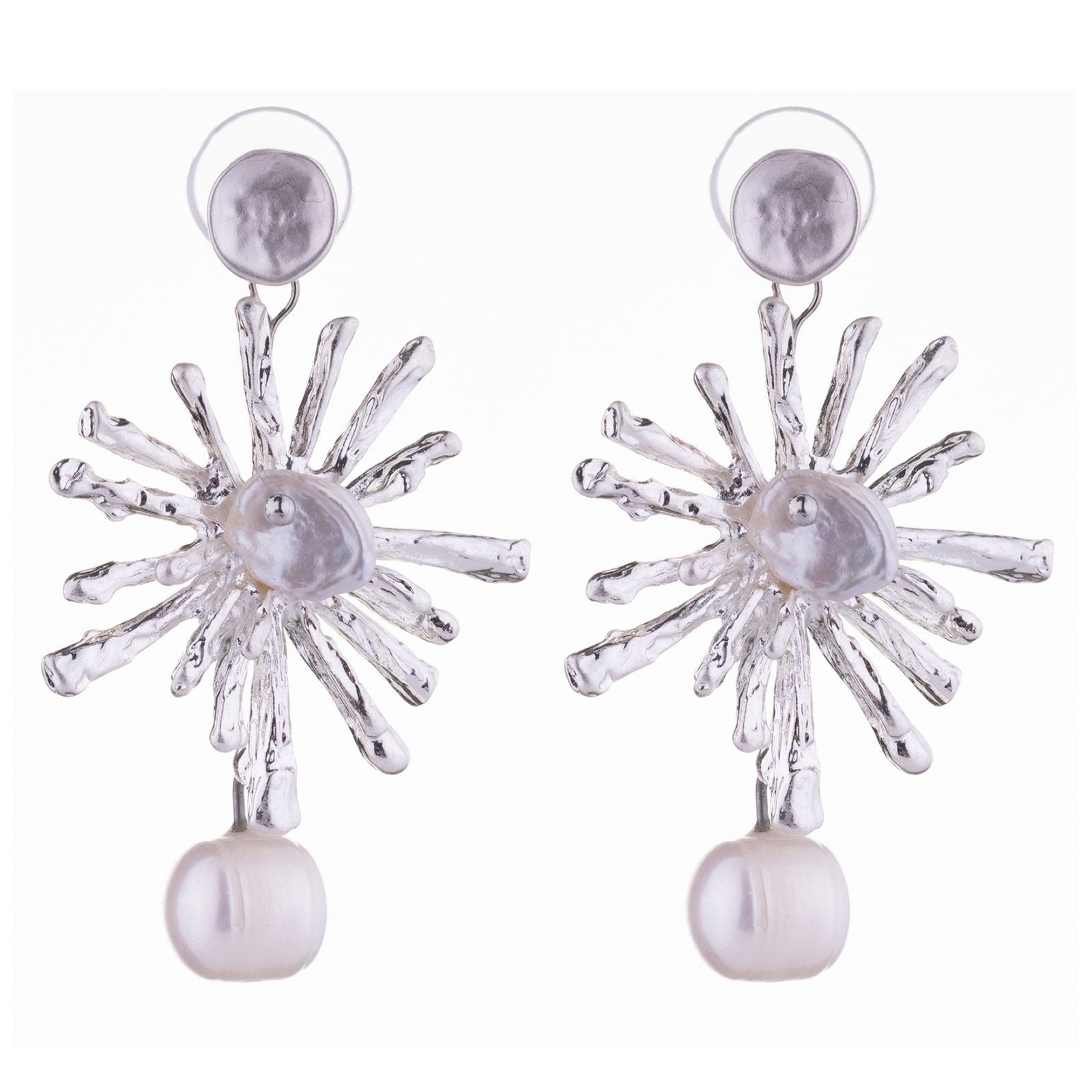 Shopika Cercei metalici argintii in forma de soare stilizat cu perle