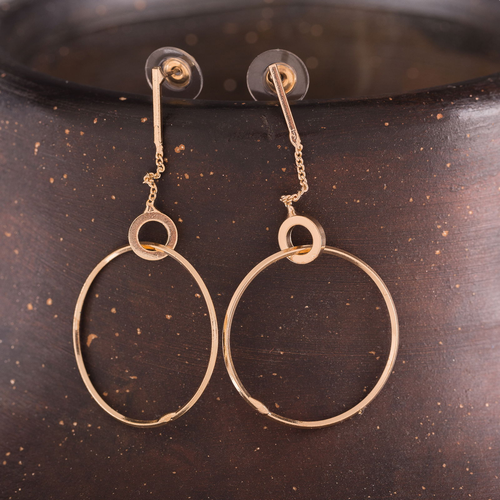 Cercei din metal auriu cu lantisor fin si piese in forma de cerc cu diametru de 3 cm.