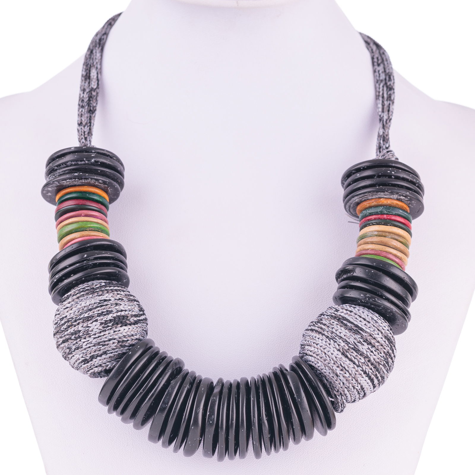 Shopika Colier cu elemente rontunde plate din lemn si textil, negru