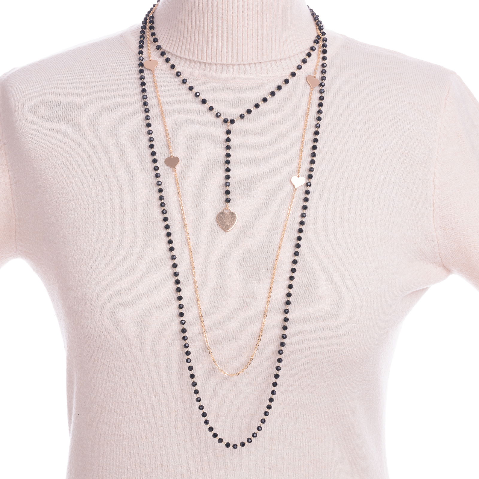 Shopika Colier lung cu 3 siruri cu inimi metalice aurii si lanturi cu margelute negre