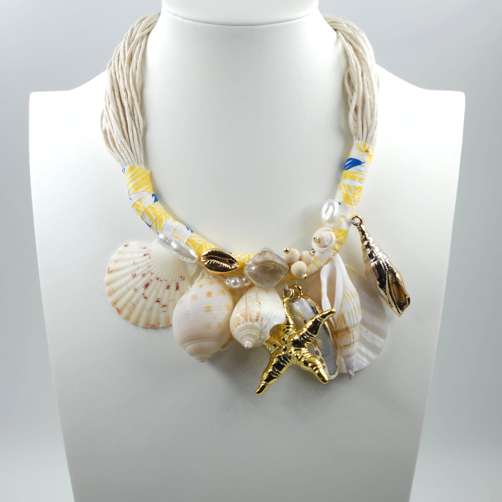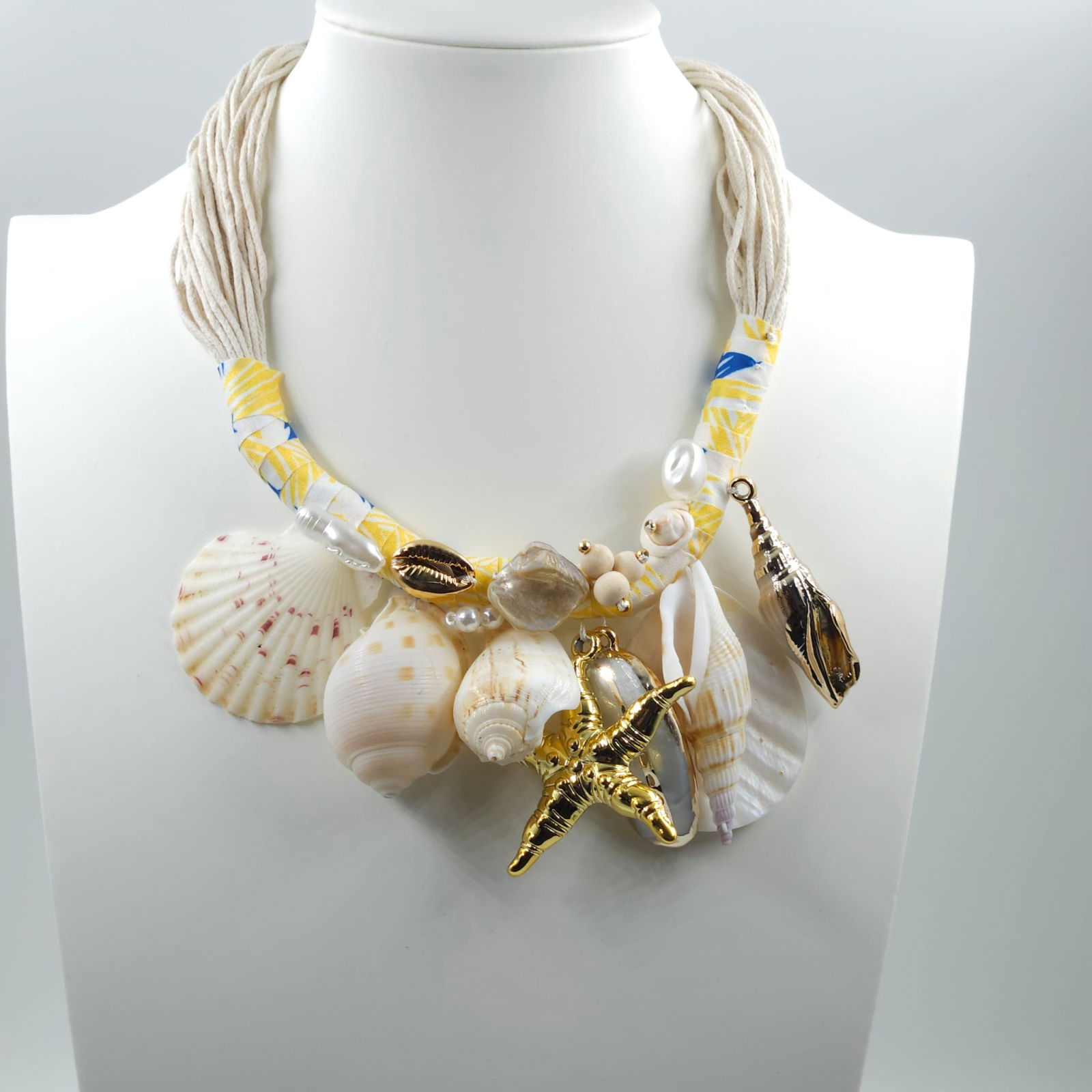 Inspirat de universul marin, acest colier statement imbina scoici decorative, elemente inspirate din mare si accente aurii intr-o compozitie bogata si spectaculoasa. Texturile naturale si formele organice creeaza un contrast perfect intre exotism si eleganta.