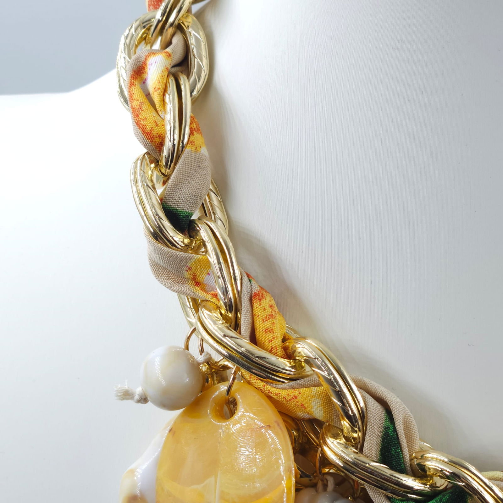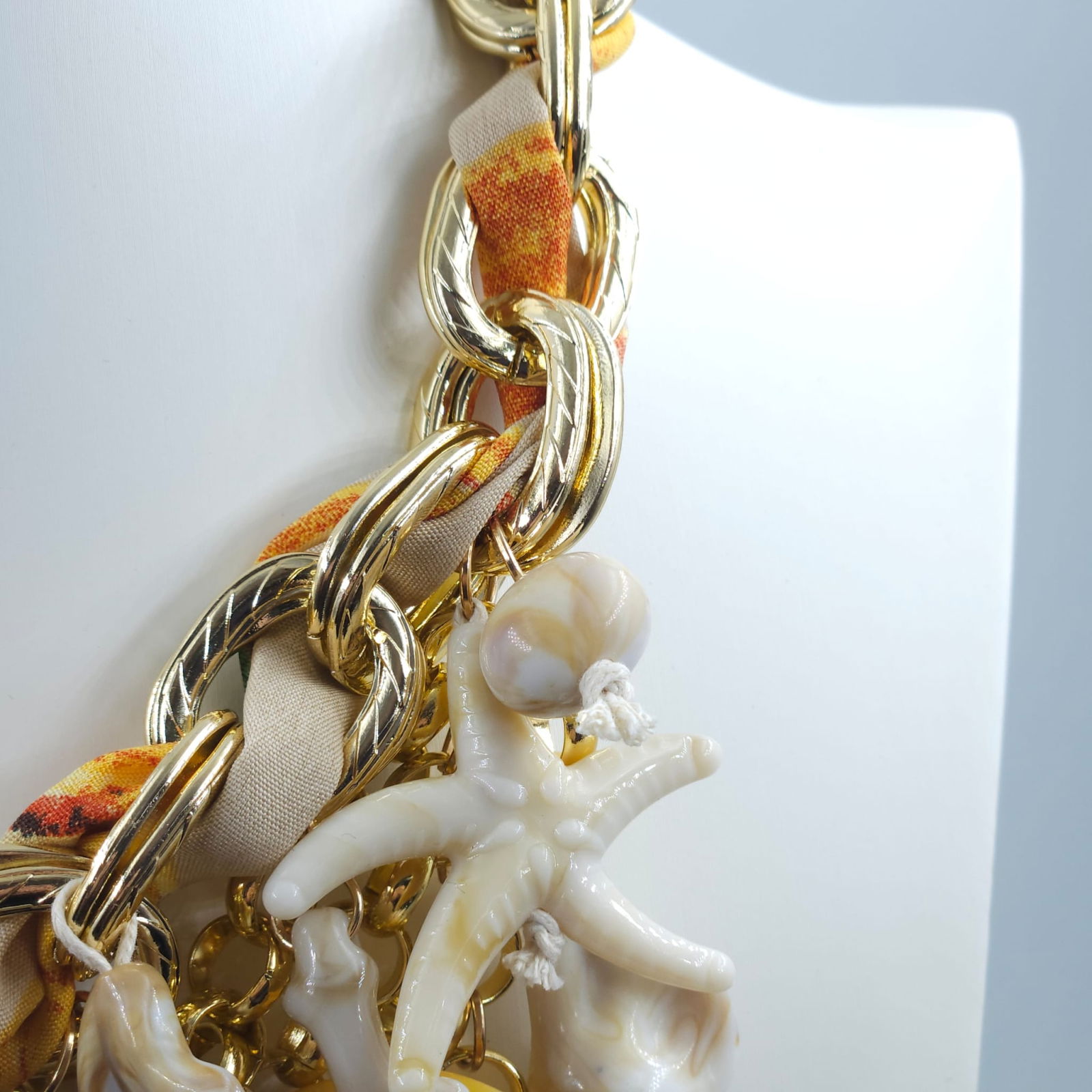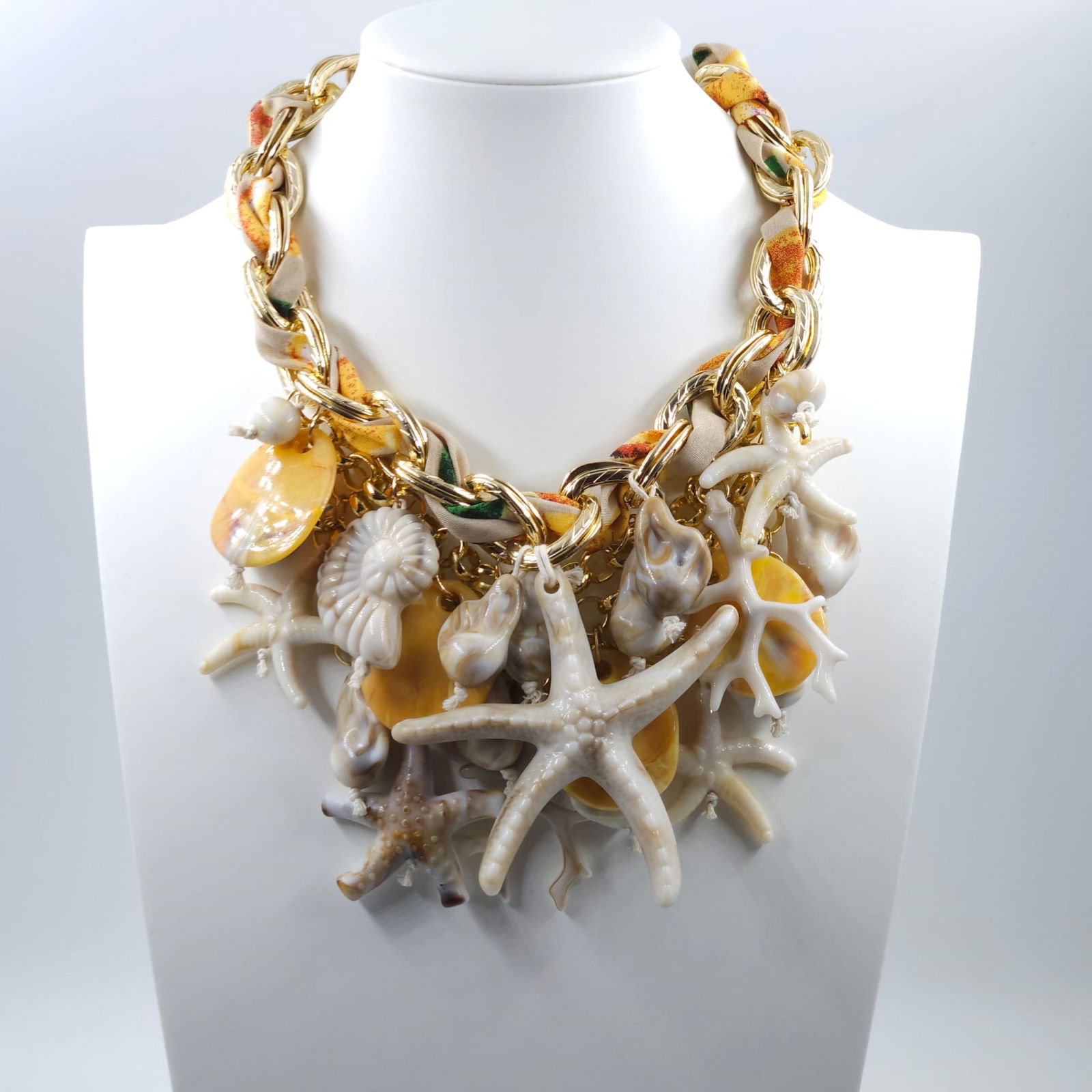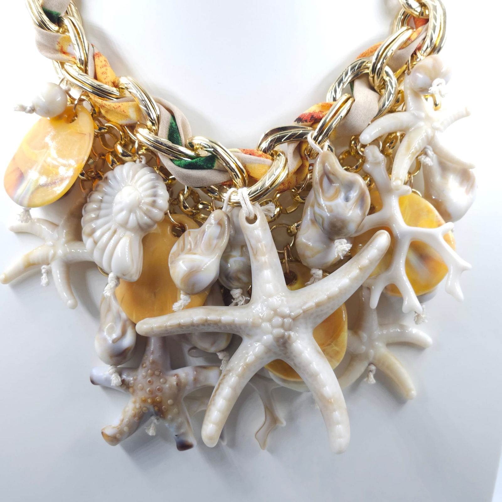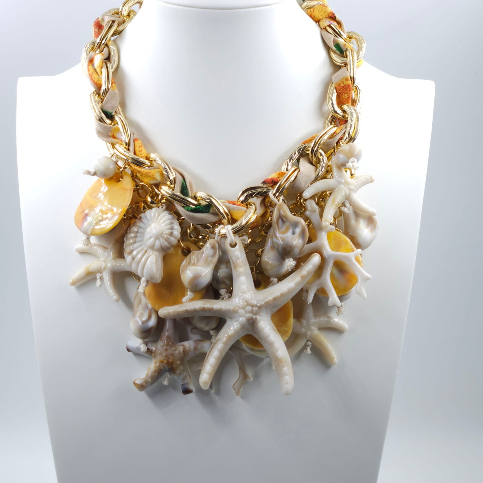 Cu un design bogat, inspirat de universul marin, aceasta piesa statement imbina lantul masiv cu accente aurii, detalii textile si o compozitie spectaculoasa de scoici, corali si stele de mare. Volumul generos si elementele supradimensionate creeaza un efect dramatic, perfect pentru tinute de vacanta sau aparitii memorabile.