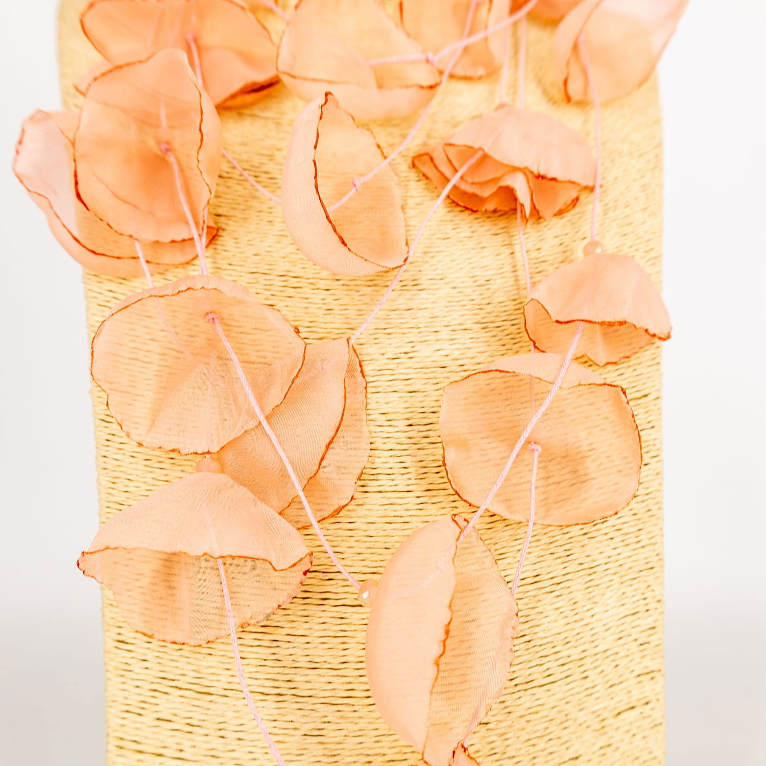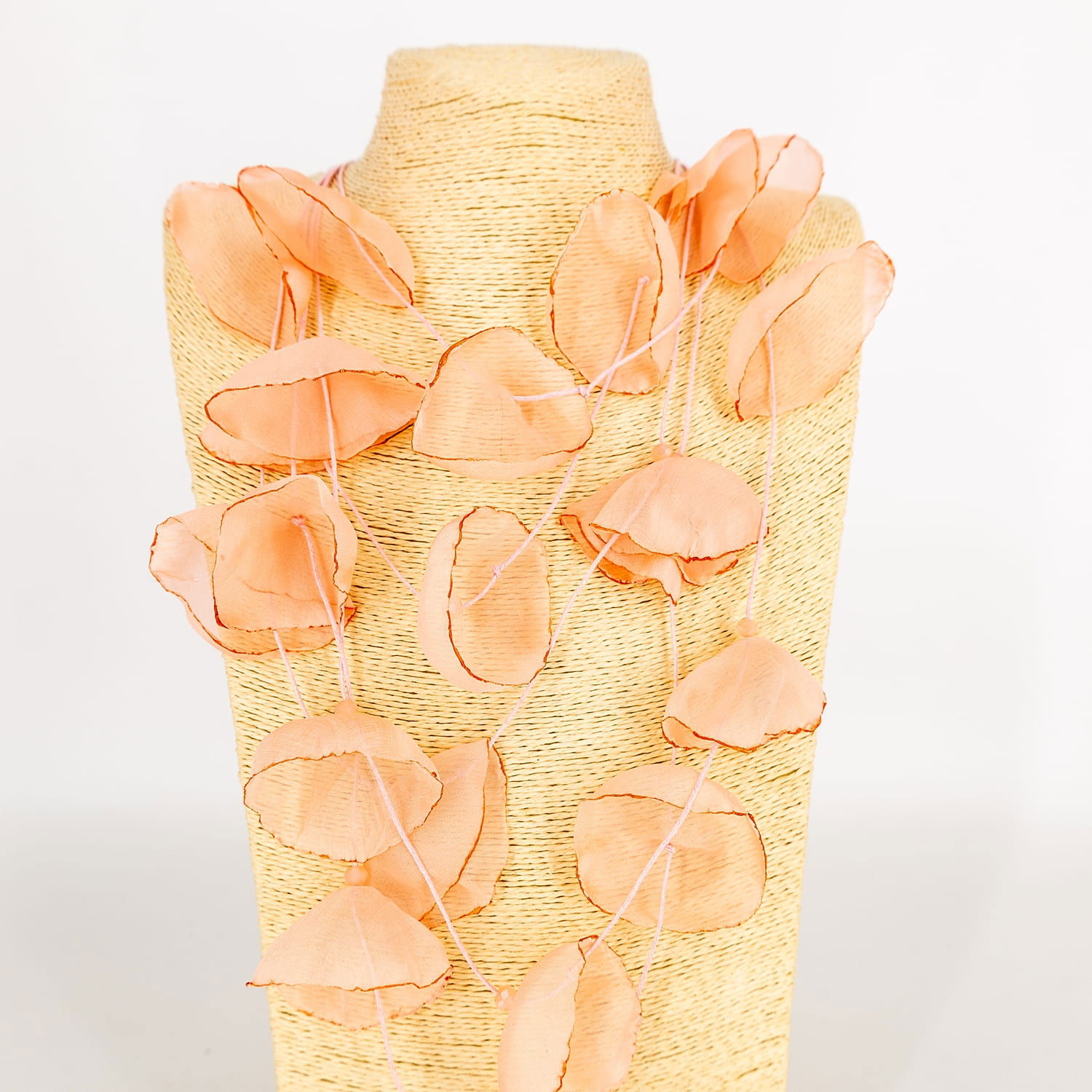 Realizat din elemente textile suprapuse, cu efect tridimensional si miscare fluida, acest colier statement este o piesa usoara, spectaculoasa si extrem de versatila. Petalele din material fin, semi-transparent, creeaza volum fara a incarca, oferind un efect aerat si sofisticat.