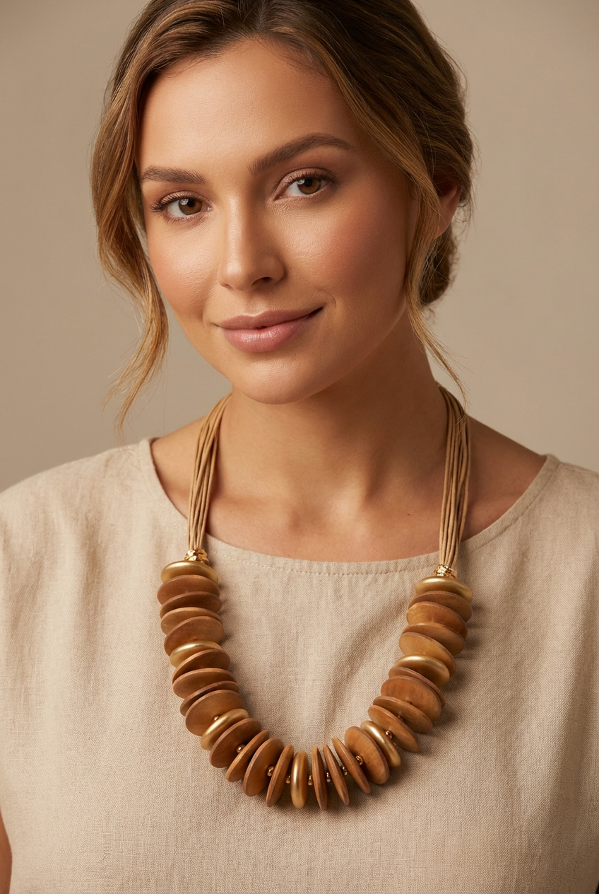 Un colier sculptural care imbina caldura lemnului natural cu eleganta discreta a accentelor aurii. Discurile din lemn, atent finisate, sunt asezate in jocuri de volum ce creeaza un efect organic, modern si usor artistic. Firele textile bej confera colierului un aer rafinat si o textura naturala, transformandu-l intr-o piesa care aduce caracter oricarei tinute. Este accesoriul ideal pentru outfituri minimaliste, tonuri neutre sau look-uri boeme, atunci cand vrei o prezenta statement dar sofisticata.