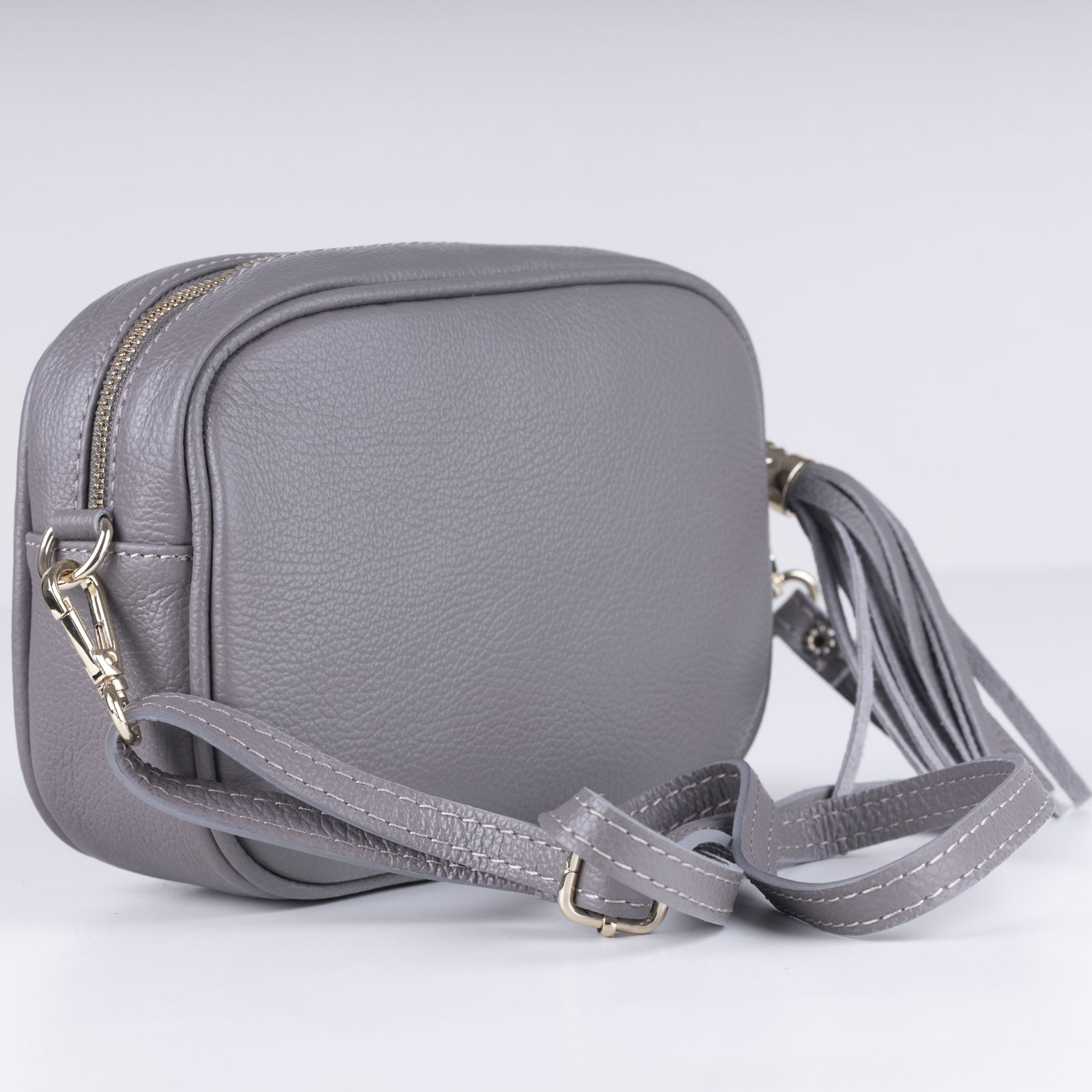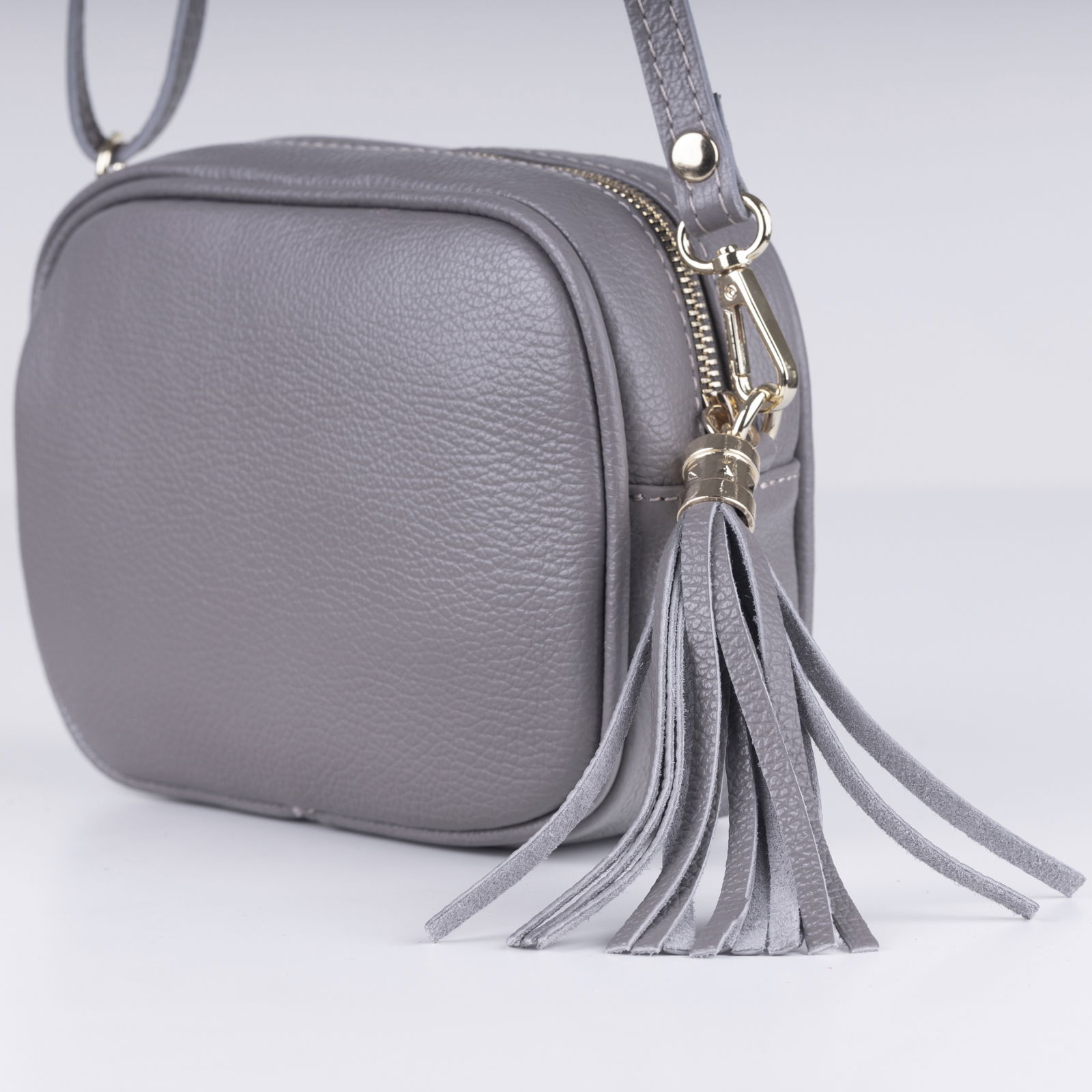 Shopika Geanta crossbody gri din piele naturala, cu ciucure din piele