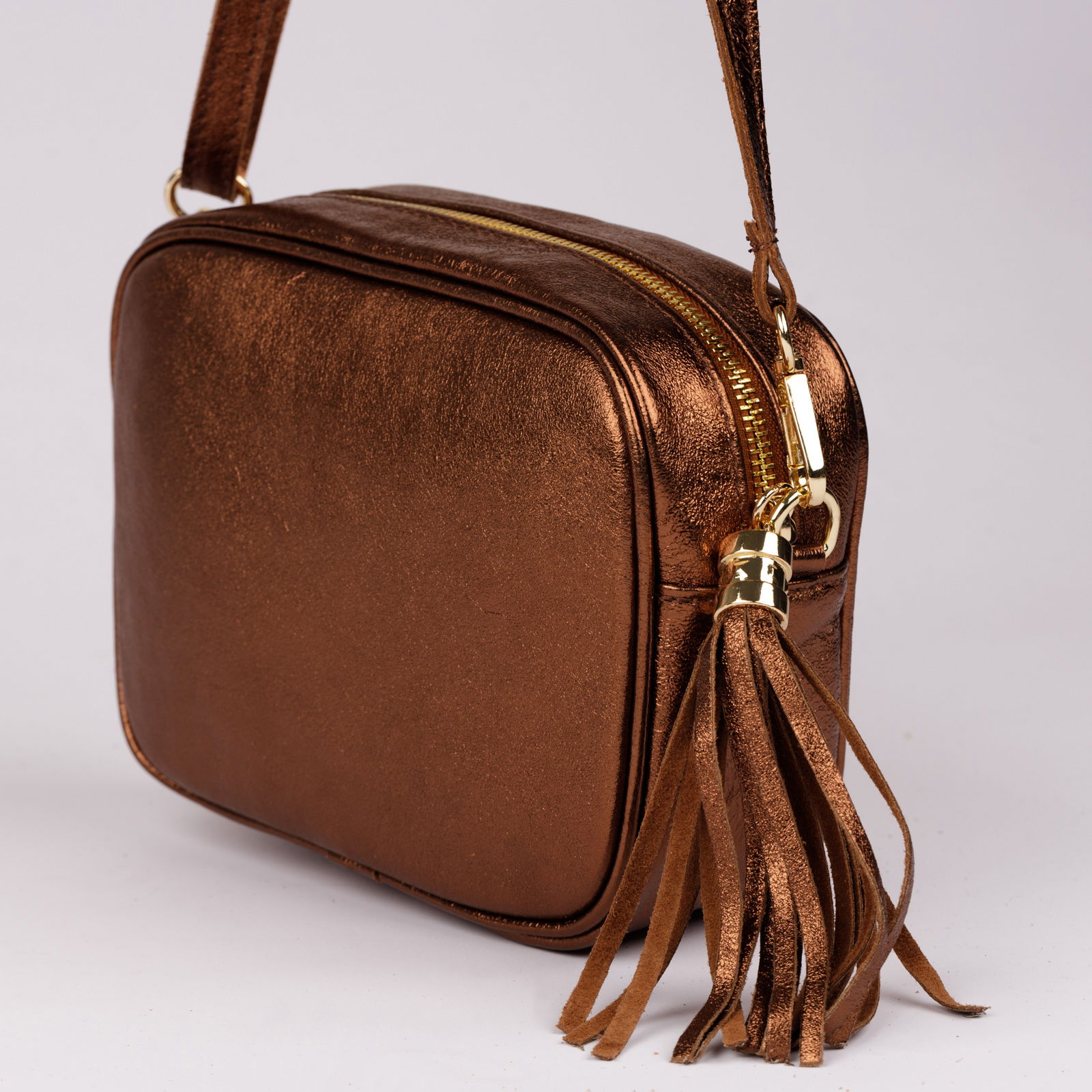 Shopika Geanta crossbody metalizat din piele naturala, cu ciucure din piele, cupru