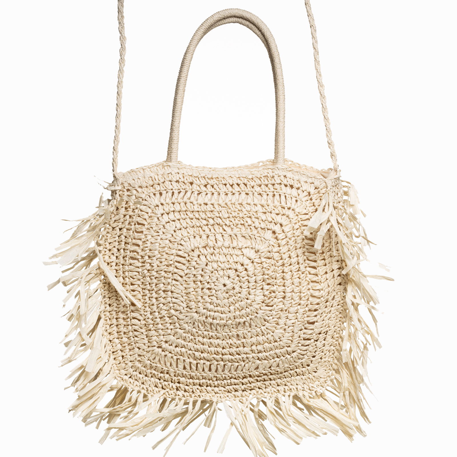 Shopika Geanta crossbody patrata mare, impletita cu franjuri mari decorative, bej deschis