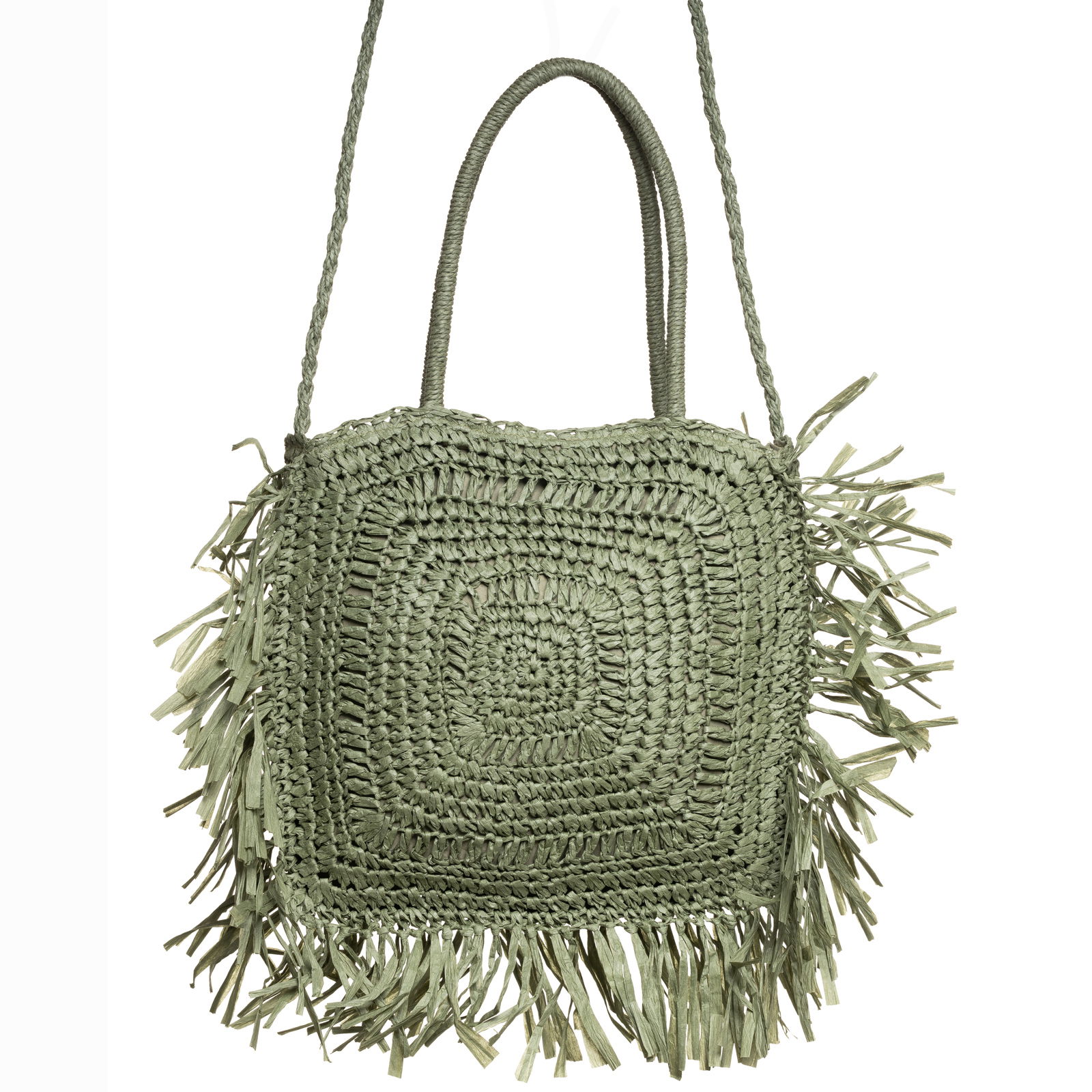 Shopika Geanta crossbody patrata mare, impletita cu franjuri mari decorative, verde prafuit