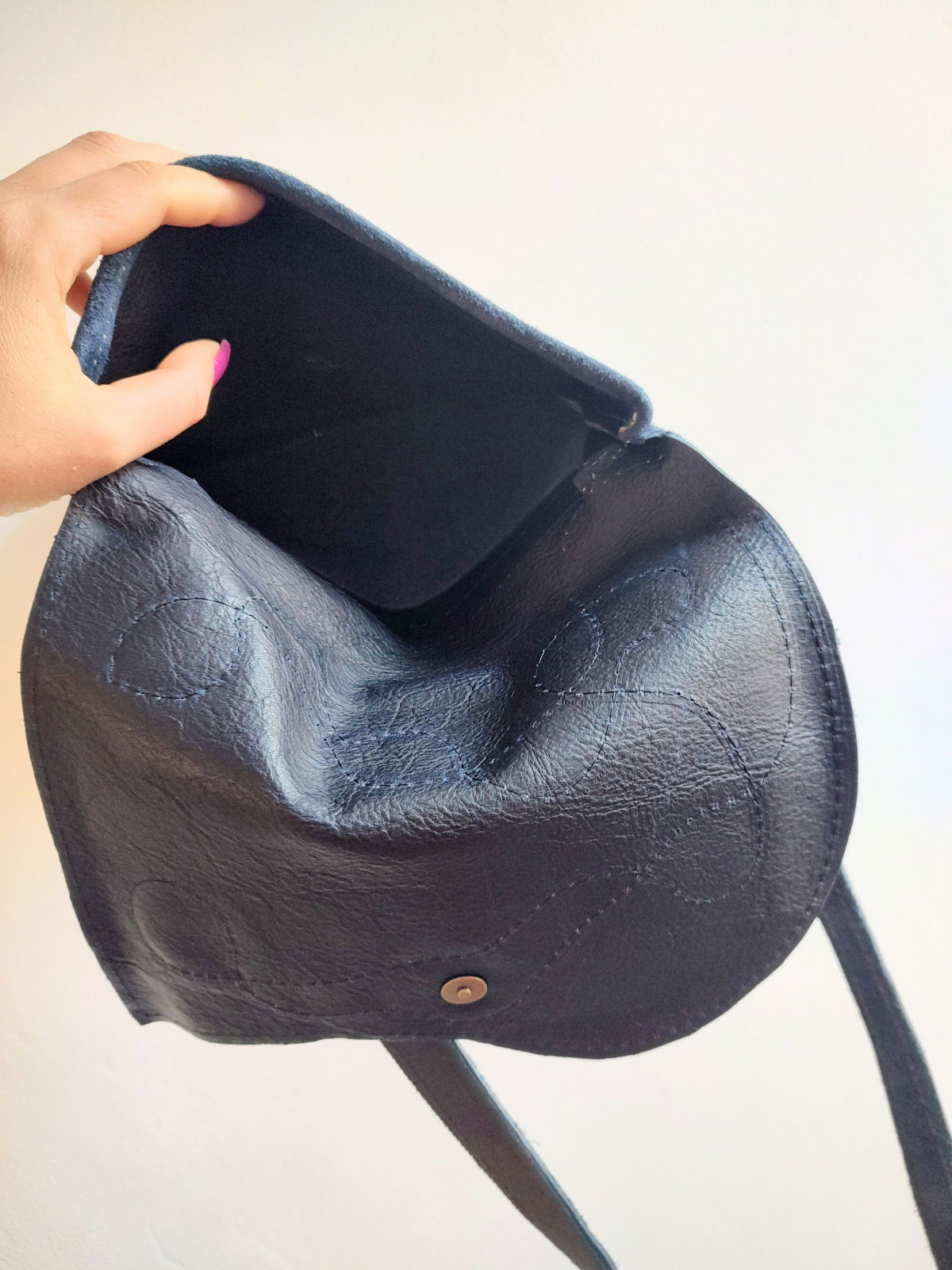 Geantă concepută în stil jucăuș ,pentru persoanele care știu să aprecieze lucrurile autentice lucrate cu suflet,nuanța bleumarin închis ,croita manual din piele naturala întoarsă ,ușor de asortat .