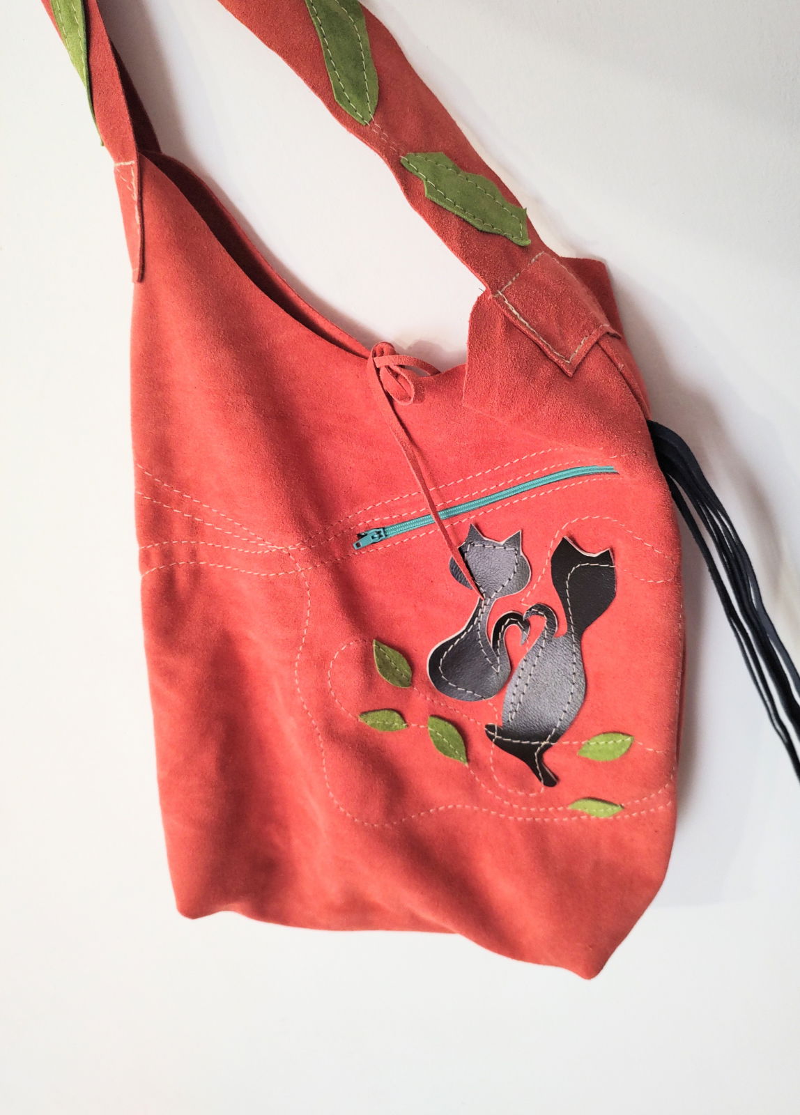 Geanta sac din piele naturala întoarsă roșie ,cu pisicute ,unicat