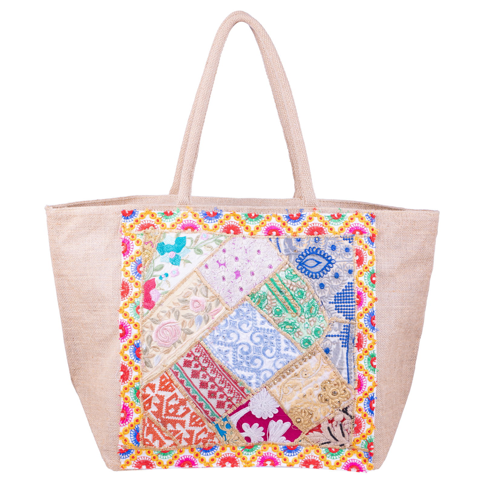Shopika Geanta bej din material textil natural tip sac, cu aplicatie unicat, brodata manual