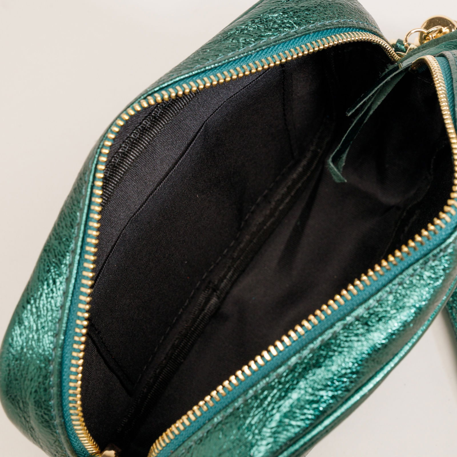 Shopika Geanta crossbody verde inchis metalizat din piele naturala, cu ciucure din piele