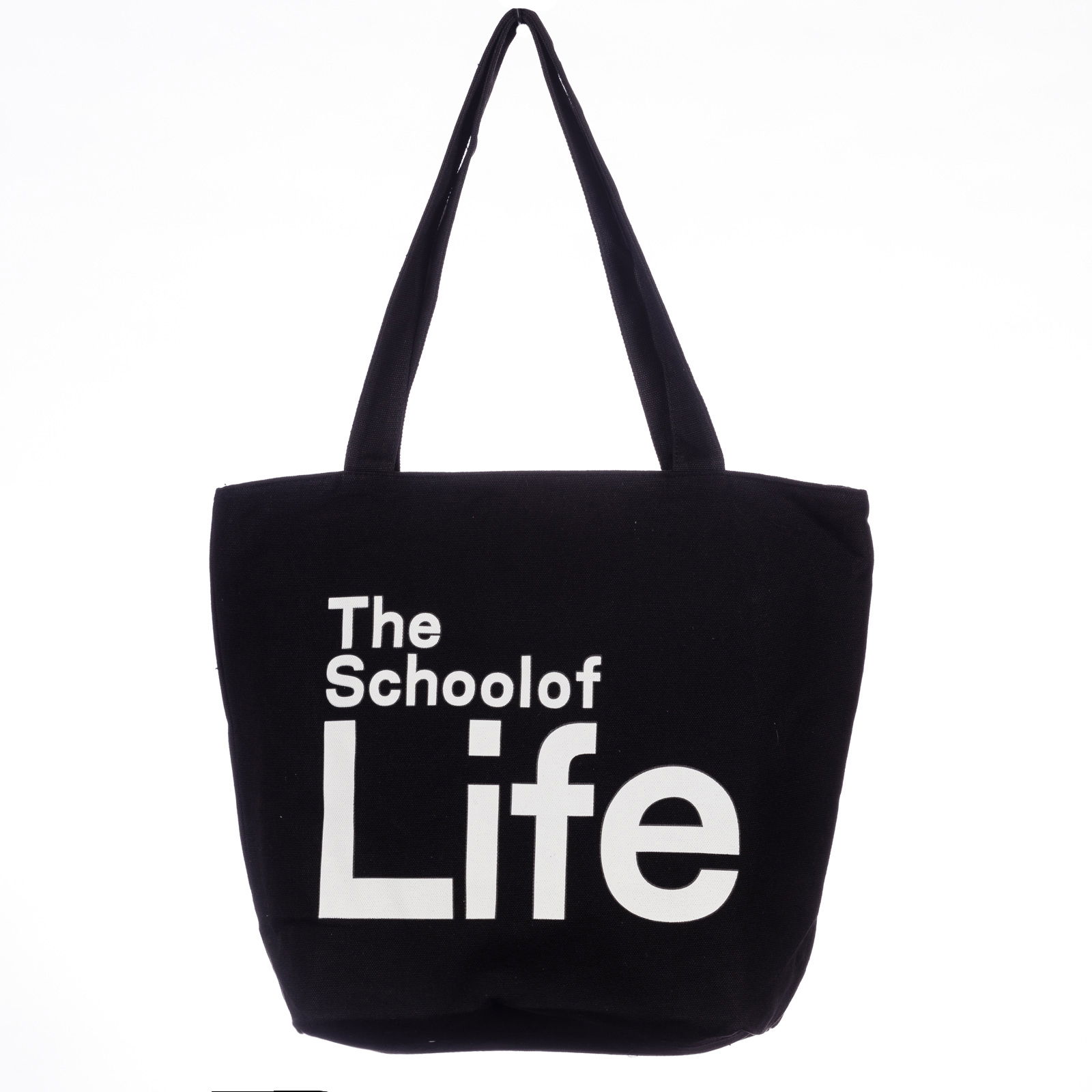 Geanta de umar din bumbac cu fermoar si imprimeu School of Life, neagra