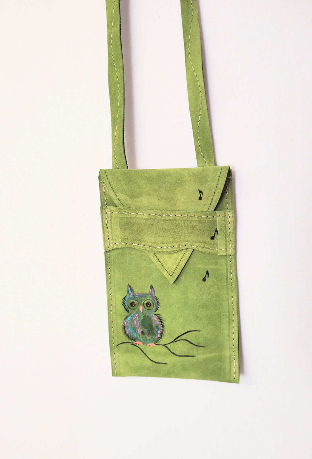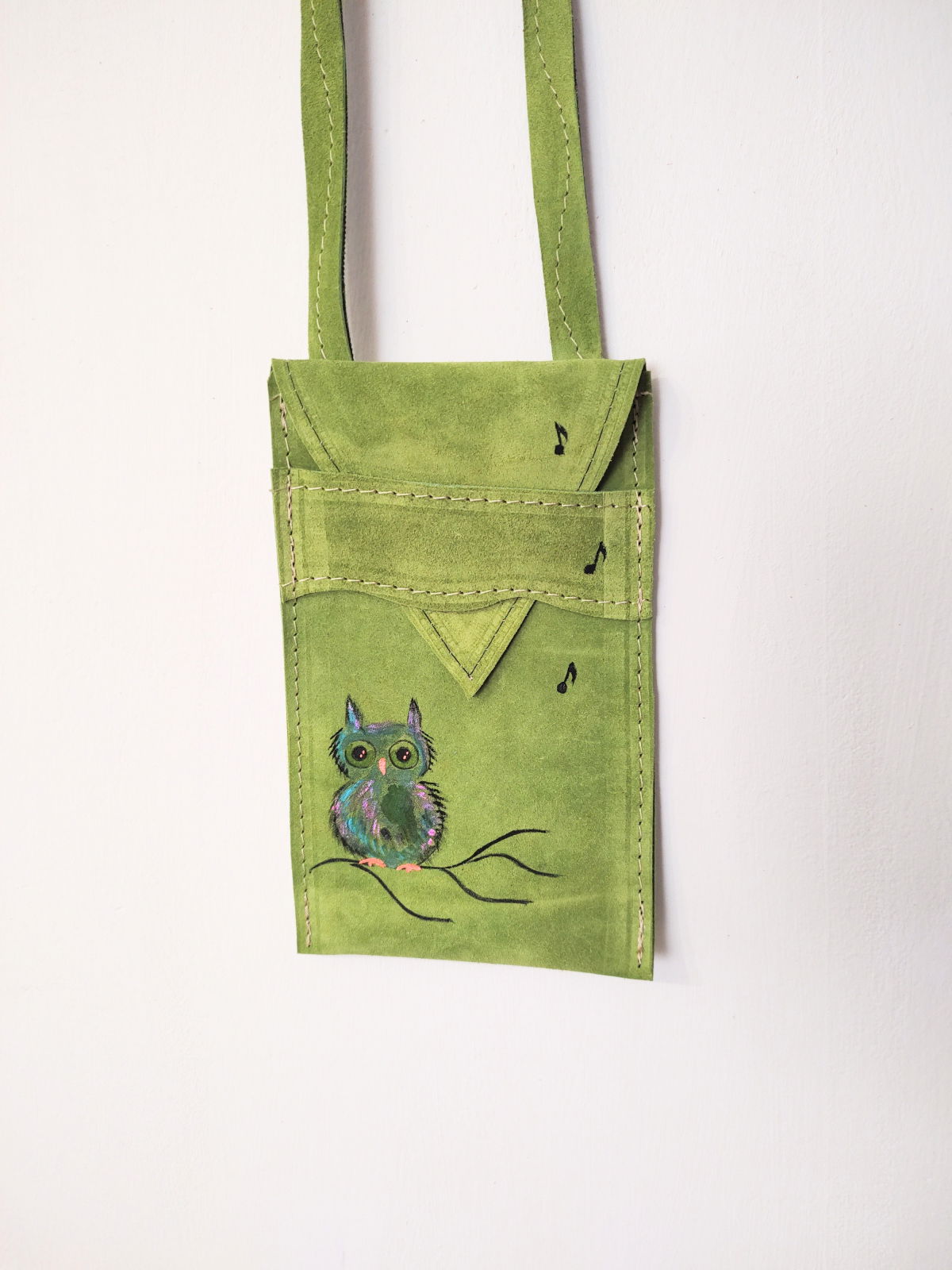 Suport verde olive , pentru telefon sau ochelari, lucrat manual, din piele naturala întoarsă , cu bufnita pictata .