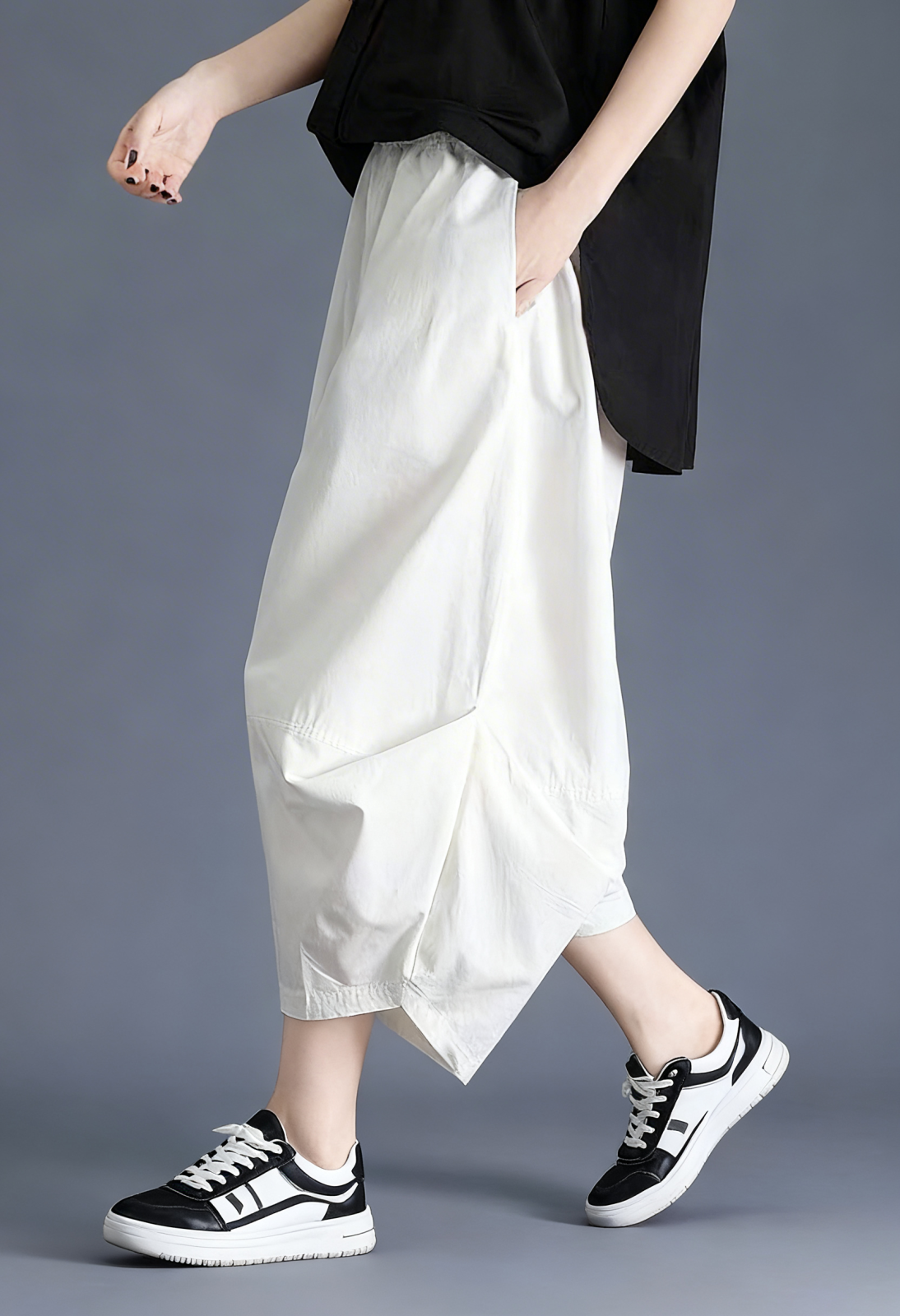 Talia elastica ofera confort si adaptabilitate, iar croiala lejera permite libertate deplina de miscare. Forma arhitecturala, cu volum concentrat in partea inferioara, transforma acesti pantaloni intr-o piesa statement usor de integrat in tinute urbane si minimaliste.