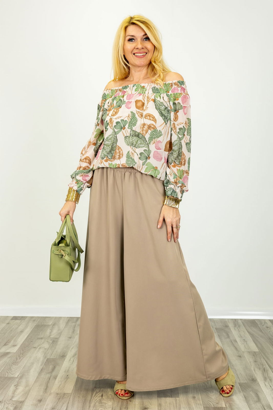 Shopika Pantaloni dama eleganti palazzo cu talie inalta si croiala fluida, bej