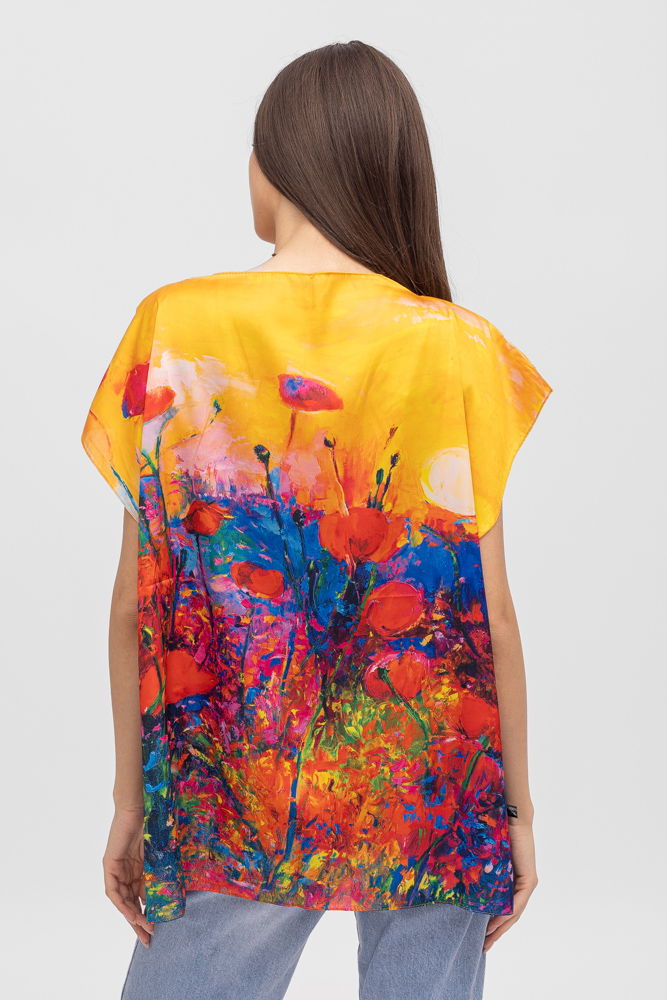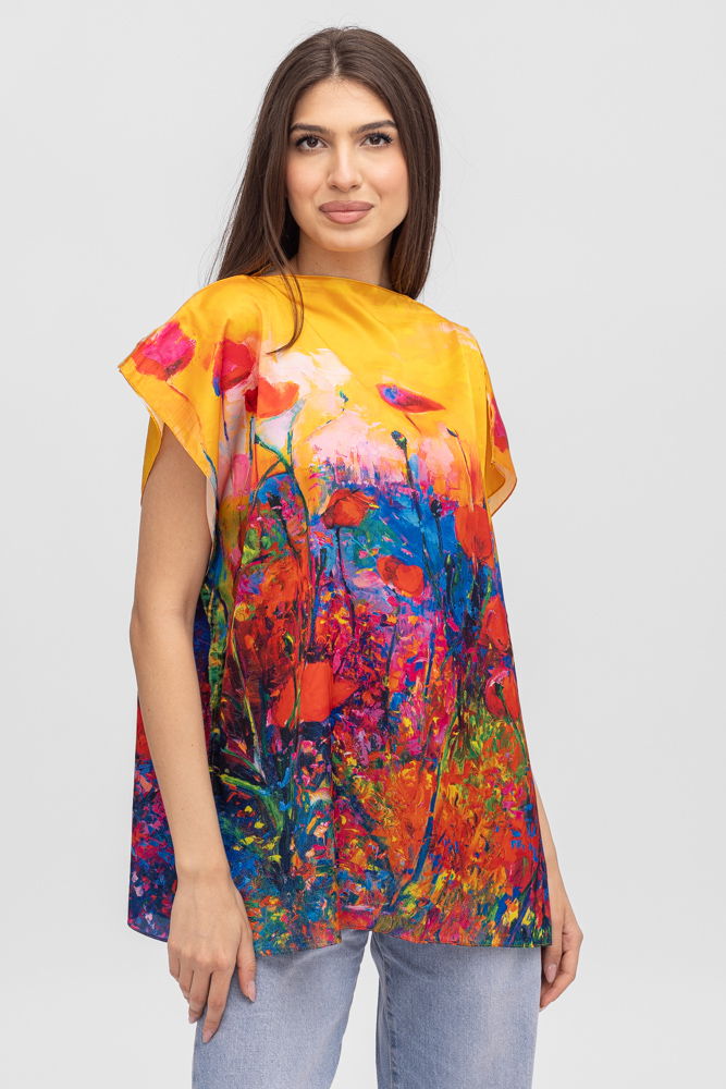 Bluza de vara tip poncho din matase cu imprimeu maci rosii