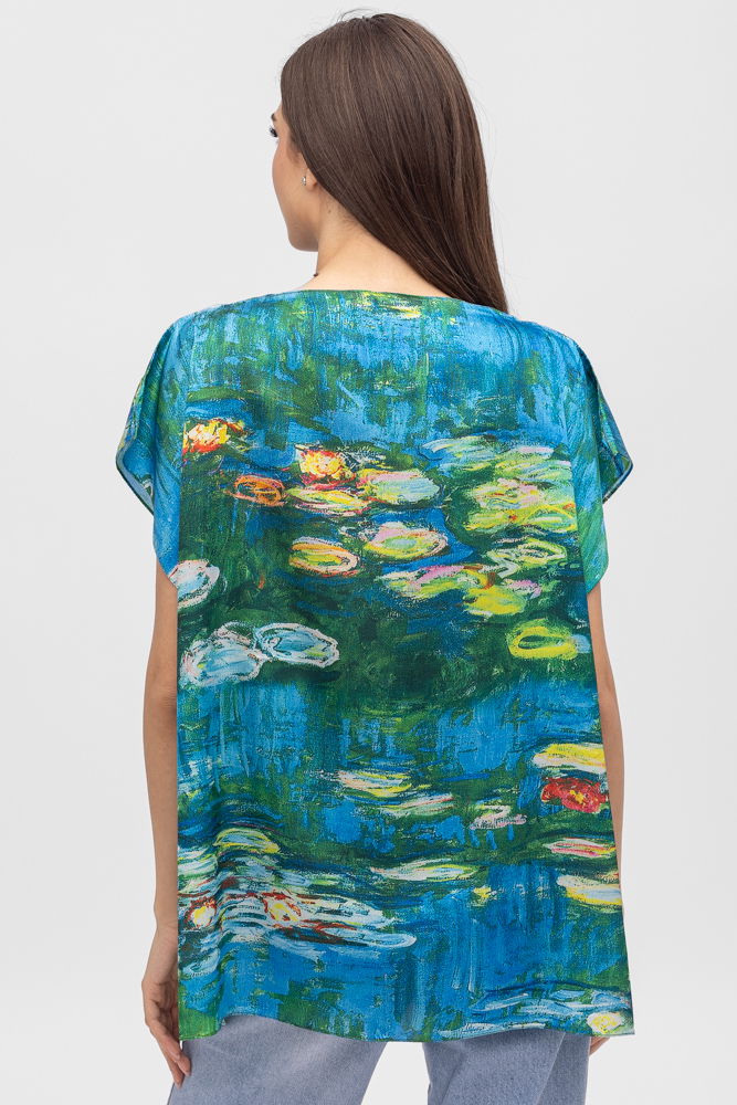 Bluza de vara tip poncho din matase cu imprimeu reproducere dupa " Nuferii" de Claude Monet