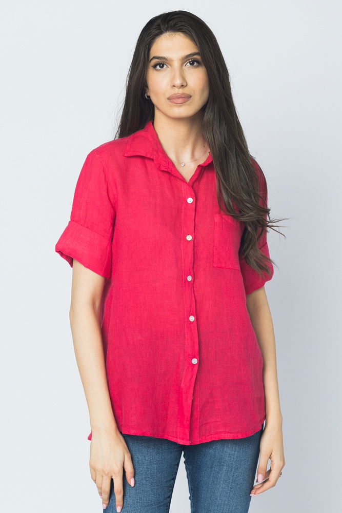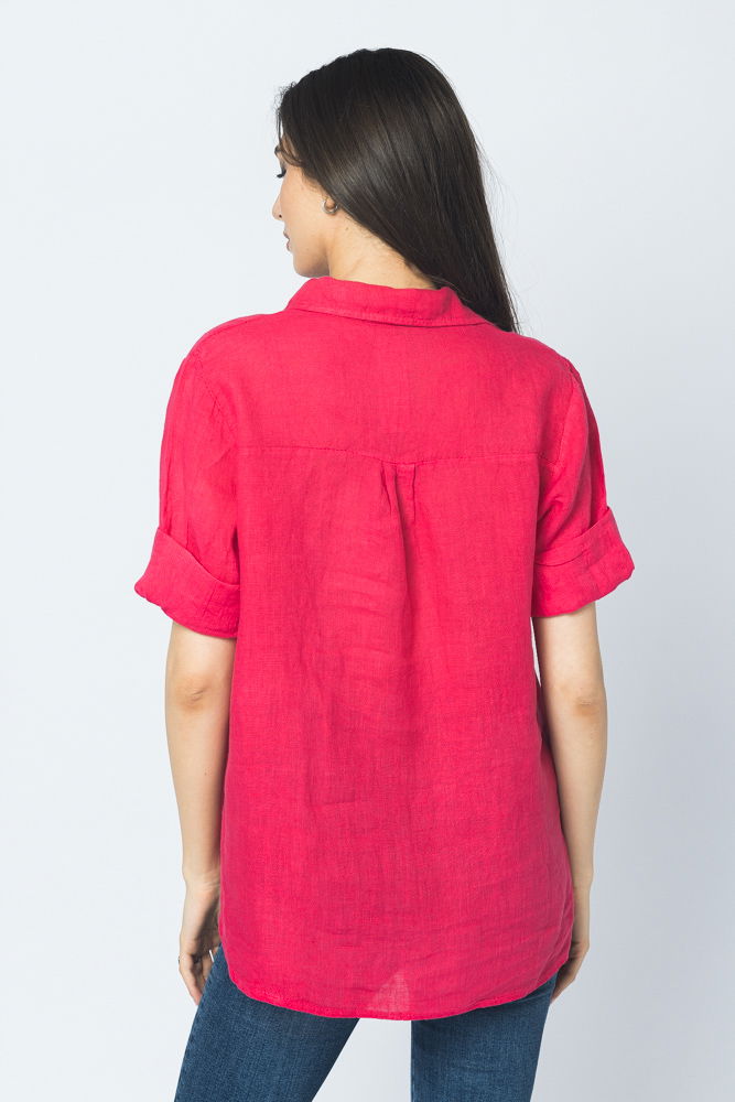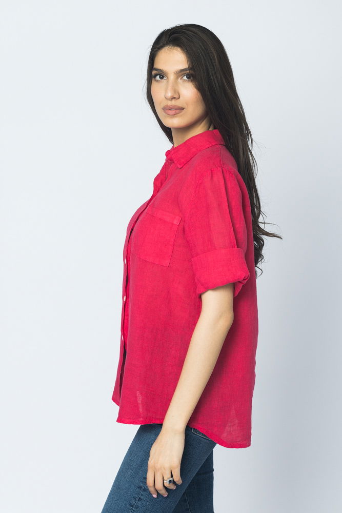 Shopika Camasa clasica din in cu buzunar pe piept si maneca 3/4, roz intens