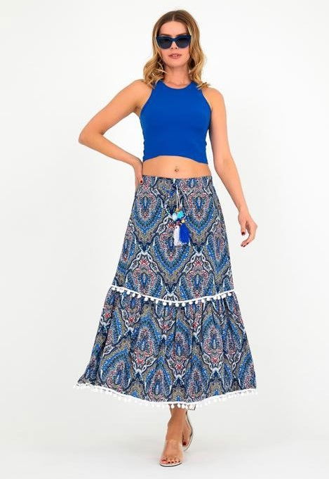 Fusta ampla cu volan, din vascoza, cu imprimeu oriental albastru
