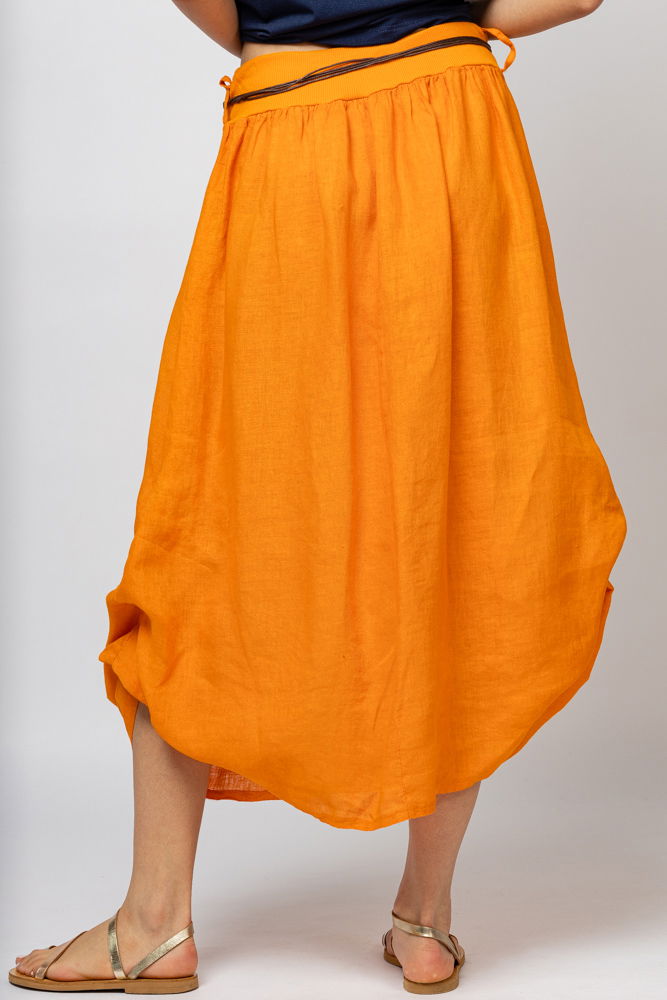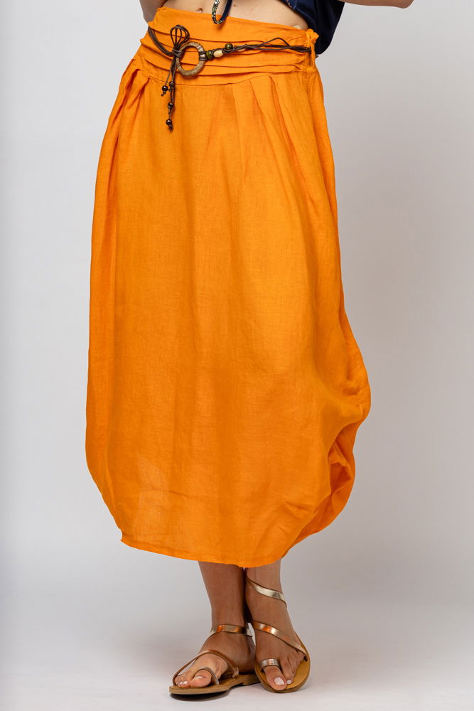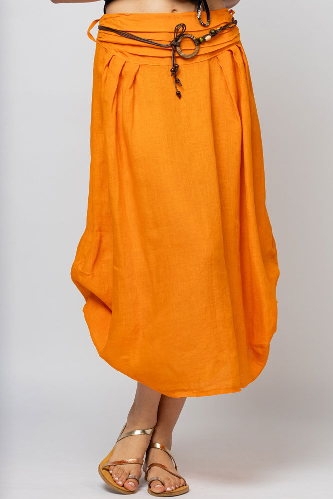 Shopika Fusta lunga portocalie cu poale prinse, din in, cu o curea fancy