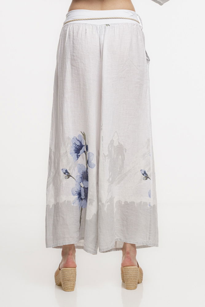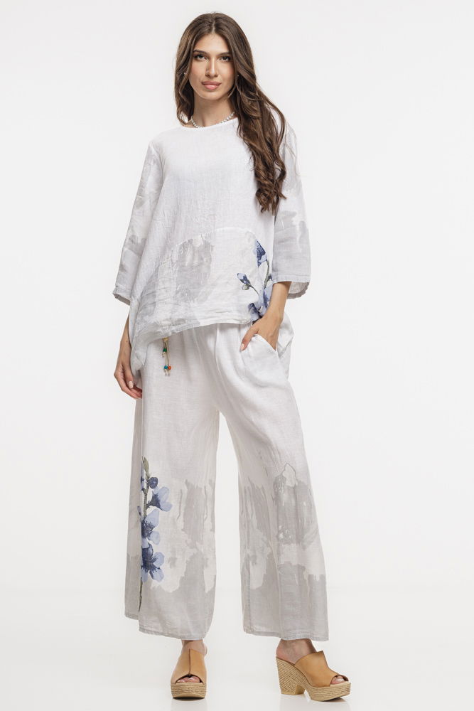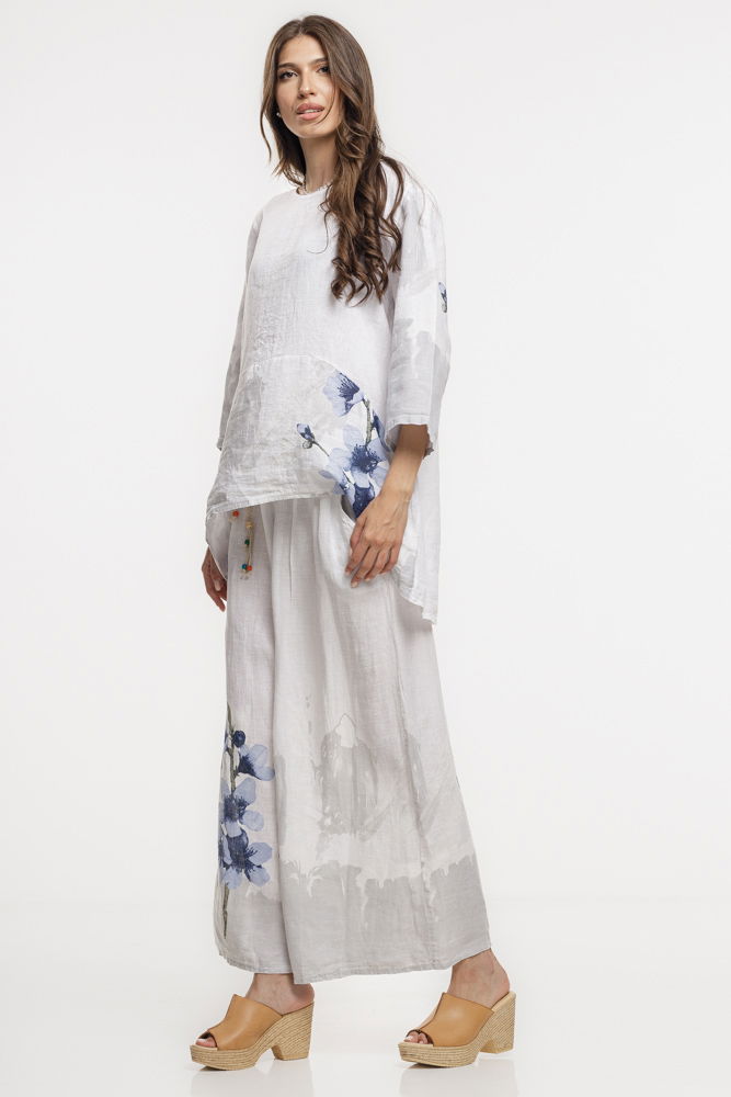 Pantaloni de vara comozi si stilati, realizati din in usor si respirabil. Croiala larga si fluida asigura libertate de miscare si confort pe tot parcursul zilei. Decorati cu un imprimeu floral pictural in tonuri naturale, acesti pantaloni aduc un plus de originalitate tinutei tale. Au talie elastica cu snur decorativ si buzunare laterale discrete. Perfecti pentru vacanta, plimbari urbane sau tinute boho chic.