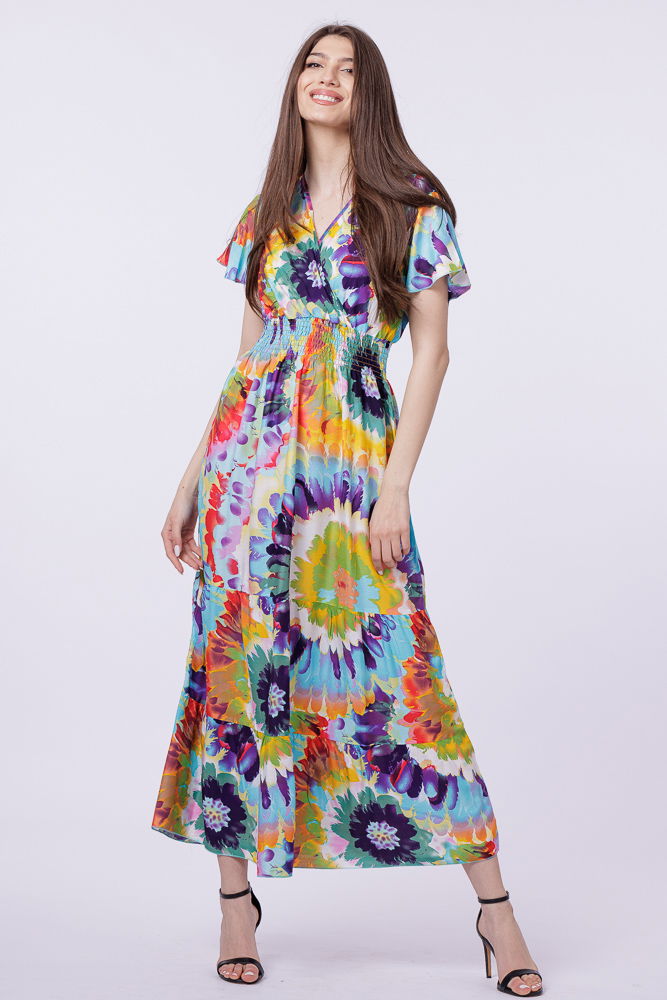 Shopika Rochie cu talia evidentiata si bust petrecut, imprimeu floral predominant turcoaz